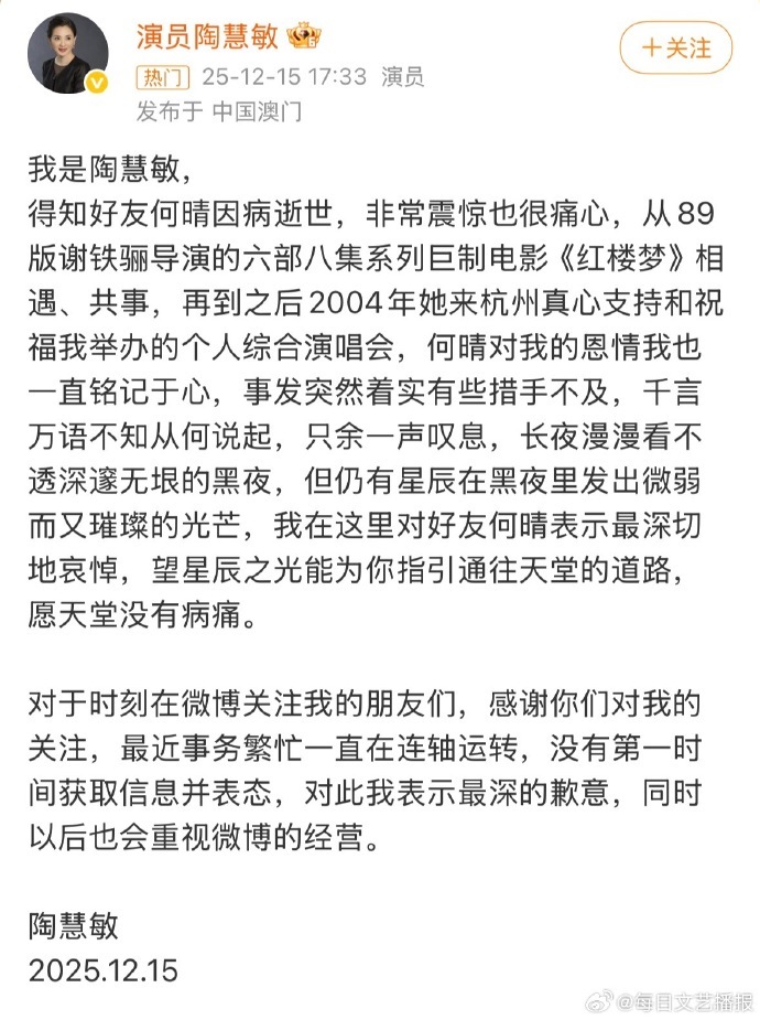 12月13日,演员何晴在北京安详离世,享年61岁。15日上午10时许,何晴的告别仪式在北京举行。 演员陶慧敏晒2004年与剧组的合影并发文:悼念何晴,天堂没有病痛,一路走好。