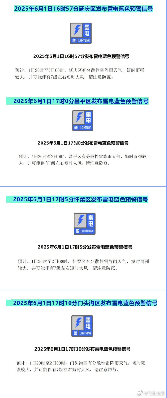 据北京市气象局消息,6月1日,延庆、门头沟、昌平、怀柔4区发布雷电蓝色预警。预计,1日20时至2日00时,部分地区有分散性雷阵雨天气,短时雨强较大,并可能伴有7级左右短时大风,请注意防范。