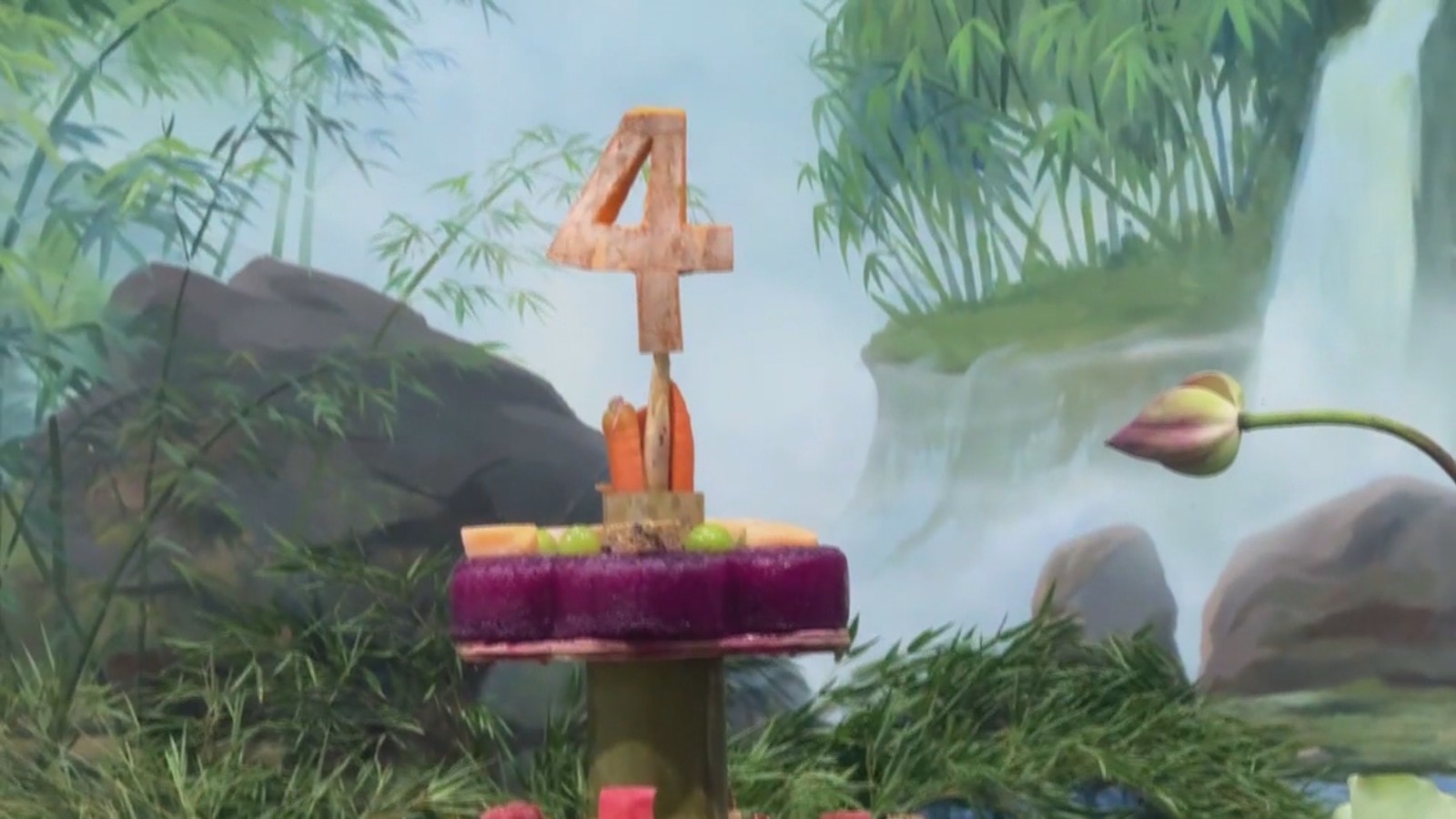 寿星“香果”的生日宴可谓国风感满满。内展厅里,铺上了不少荷叶与荷花,定制的生日蛋糕有三层,每层蛋糕分别是用火龙果、青菜、胡萝卜等果蔬榨汁冰冻而成,还搭配上了西瓜、哈密瓜、西红柿等当季果蔬。