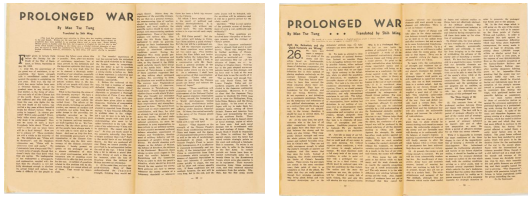 上海出版的英文杂志CandidComment从1938年11月至1939 年2月连载发表《论持久战》成为《论持久战》的首次英译版本。