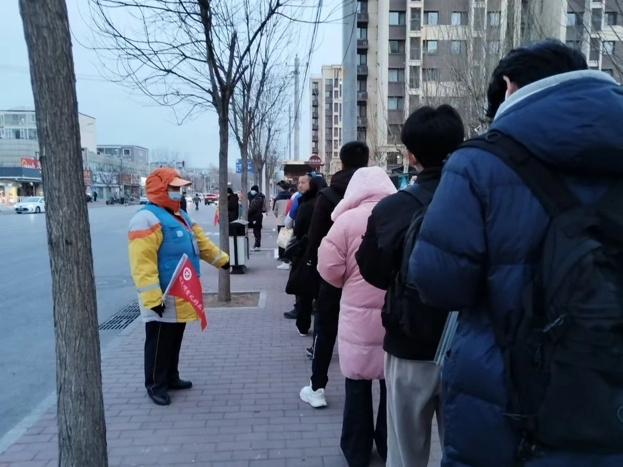 12月11日,北七家中队各个公交站台的引导员正有序引导乘客排队乘车,并在侯车排队中向乘客发放控烟宣传倡议书,对正在吸烟的市民进行“一对一宣传”。
