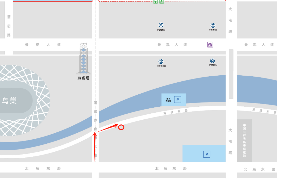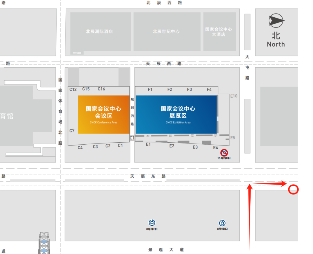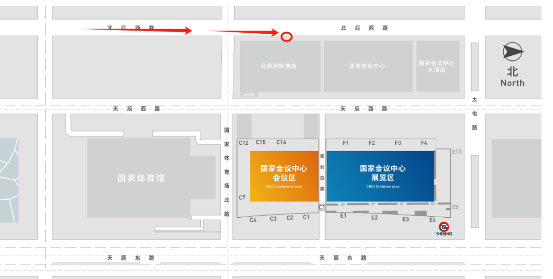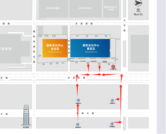 2.入园线路:从落客点沿北辰西路→国家体育场北路向东步行约400米,最终由天辰东路与国家体育场北路交界处到达服贸会区域,全程约5分钟。