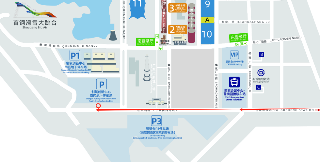 2.入园路线:从落客点沿石景山路向东步行,抵达厂东门后向北步行即可到达服贸会南登录厅;或从落客点沿群名湖大街向北步行,抵达首钢园区西1门后向东步行;2种路线距离均为为500米,全程约7分钟。