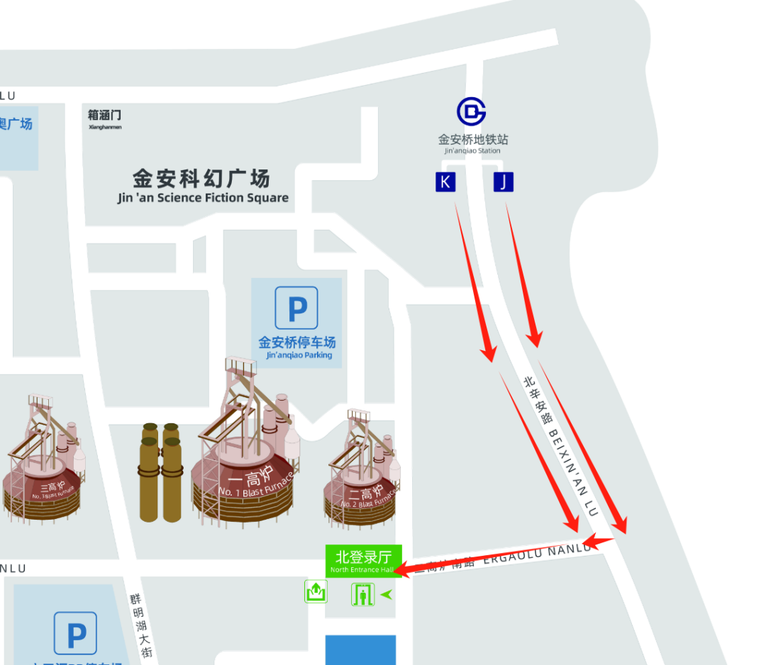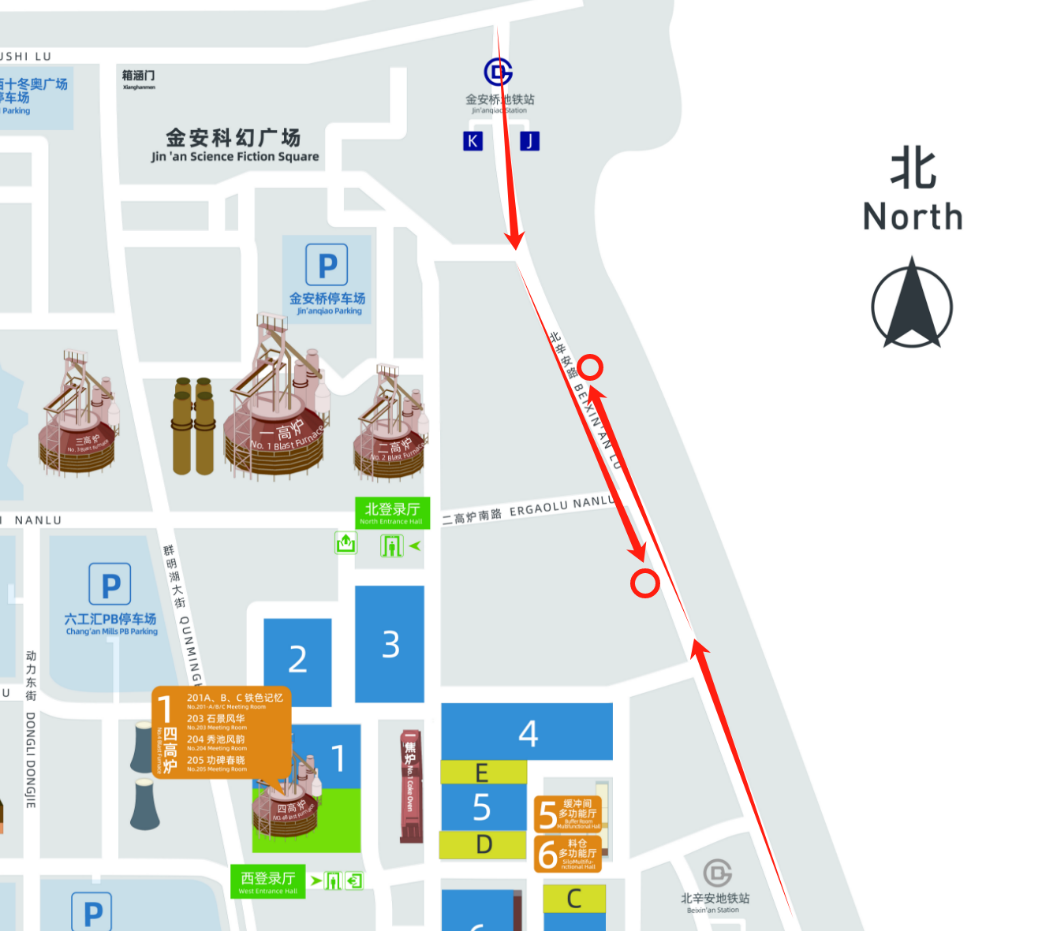 2.入园线路:从北辛安路西侧落客点沿北辛安路向北步行,东侧落客点向南步行,至二高炉南路后向西继续步行约200米,最终到达服贸会北登录厅,全程约4分钟。
