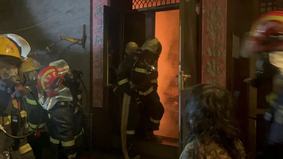 5时14分,大灰厂小型消防站率先抵达现场。此时建筑窗户和门口正有浓烟冒出,未见明火。根据“救人第一”的原则,消防救援人员立即优先开展人员搜救。在打开建筑大门后,发现内部客厅已处于猛烈燃烧阶段。救援人员迅速在门口过道位置发现并救出一名女性被困者。
