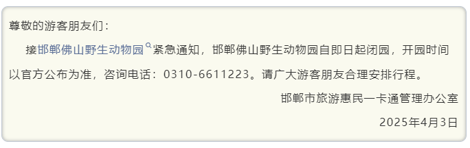 记者注意到,邯郸市旅游惠民一卡通管理办公室于今日中午12时许发布消息称,接邯郸佛山野生动物园紧急通知,邯郸佛山野生动物园自即日起闭园,开园时间以官方公布为准。