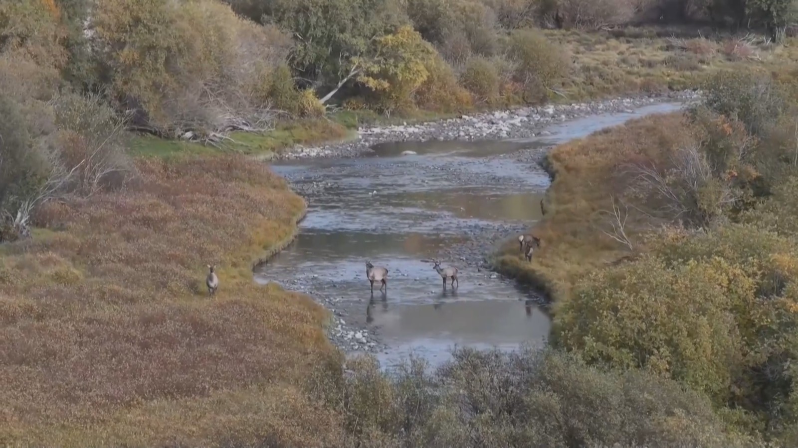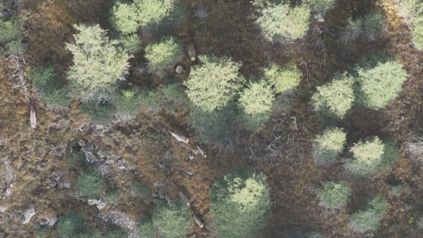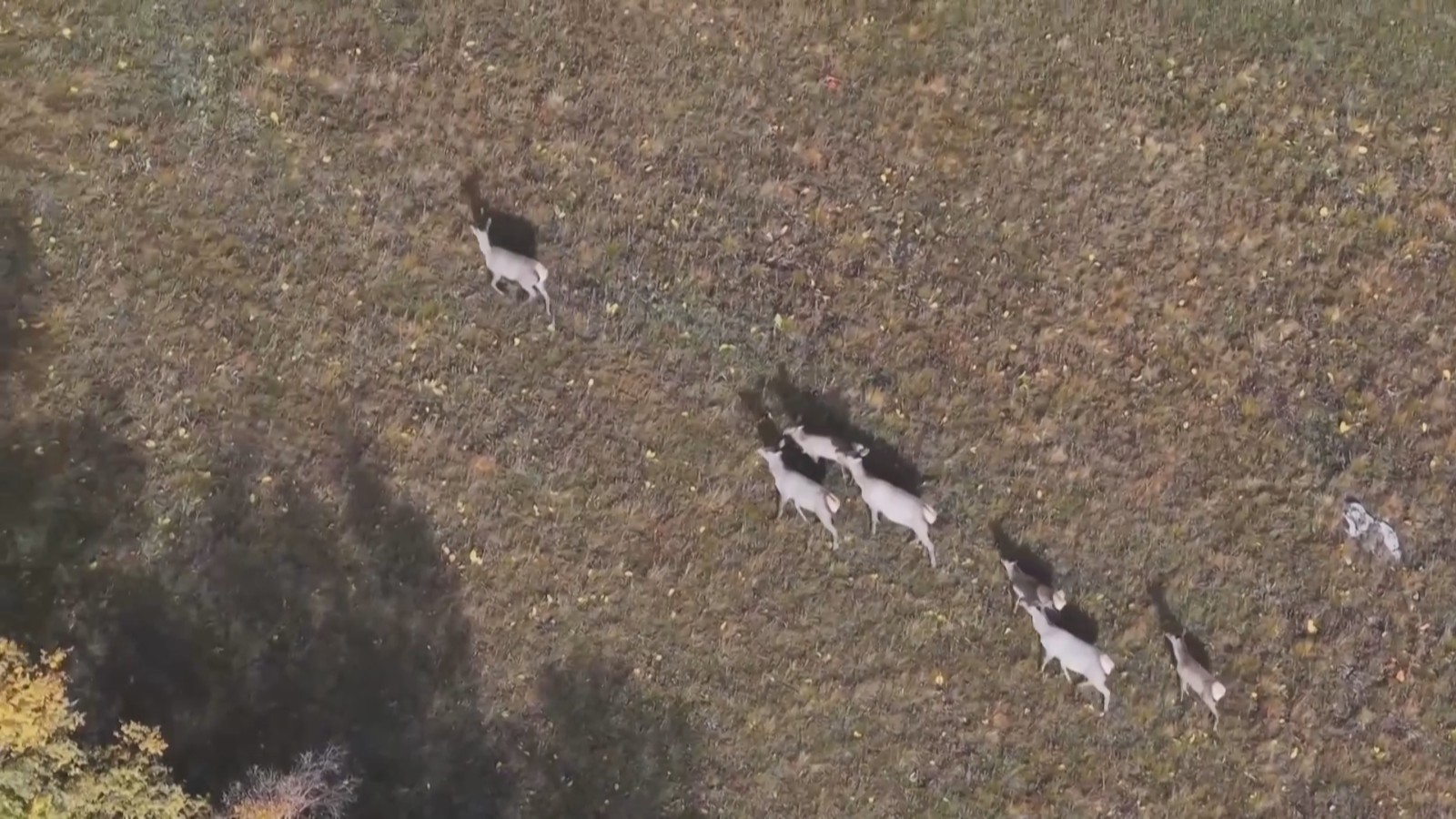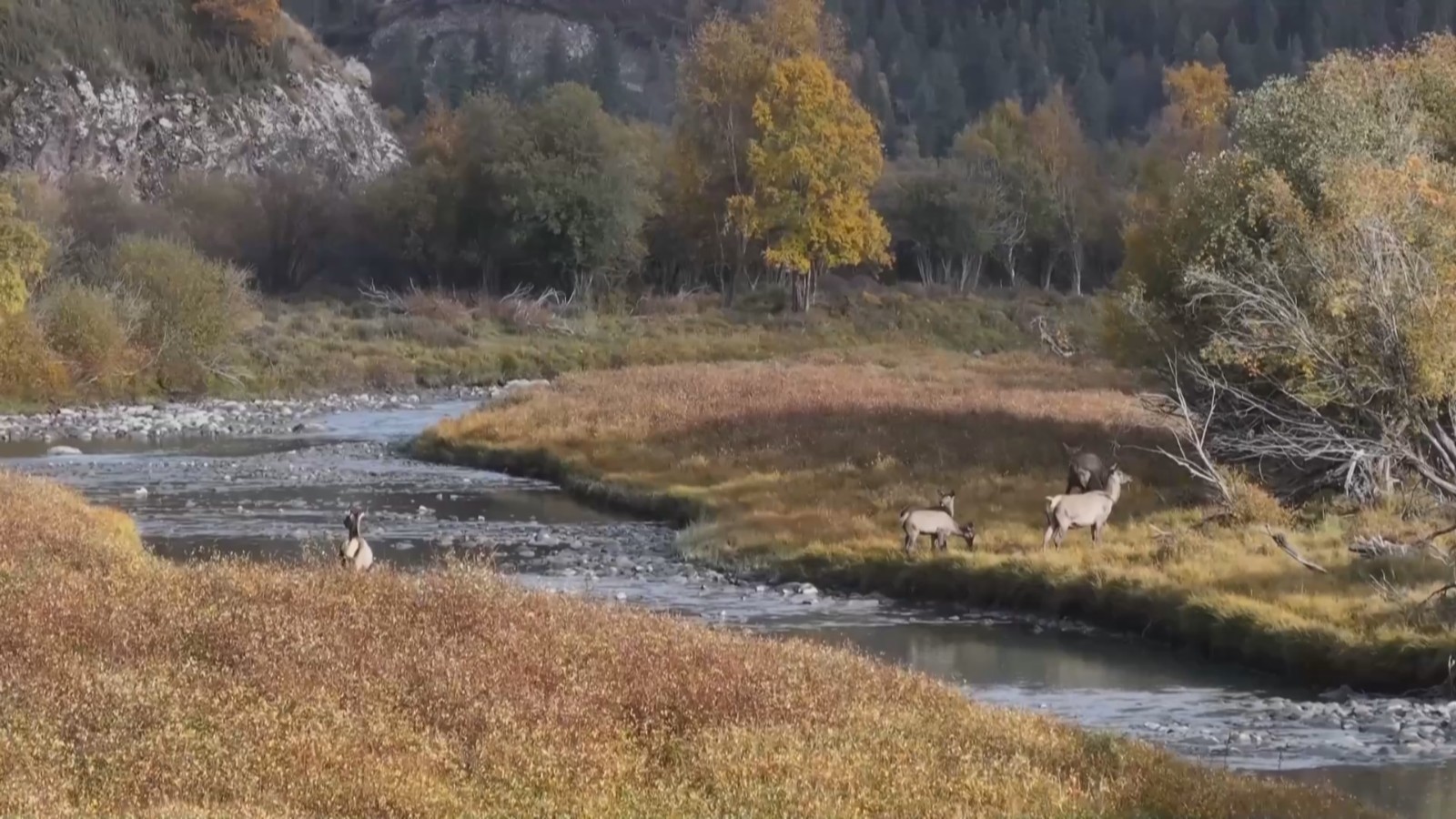在无人机镜头中,这群天山马鹿时而在林中漫步,时而追逐嬉闹。