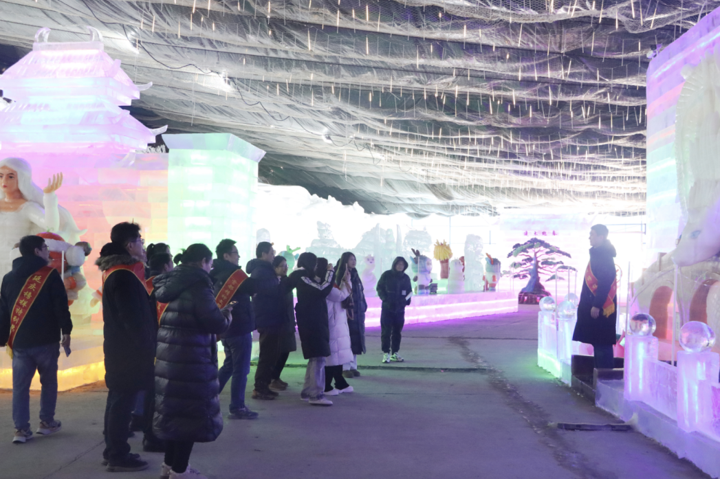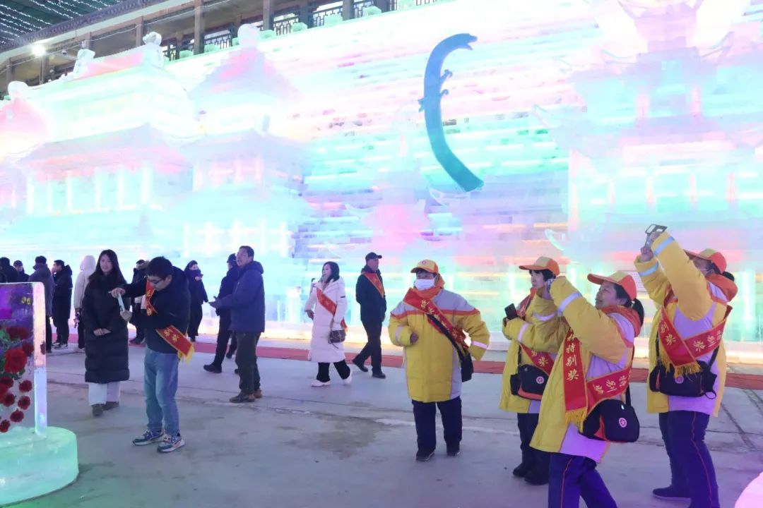 活动当日,榜样人物在讲解员的带领下开启了冰雕艺术的探索之旅。他们漫步于晶莹剔透的冰雕长廊,驻足于变幻莫测的冰灯前,被技艺精湛的冰雕作品深深吸引。每到一处,榜样们都纷纷拍照留念,记录下这份难忘的体验与感动。