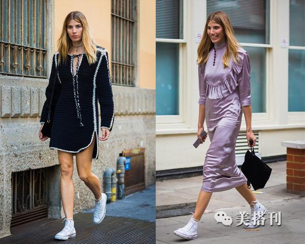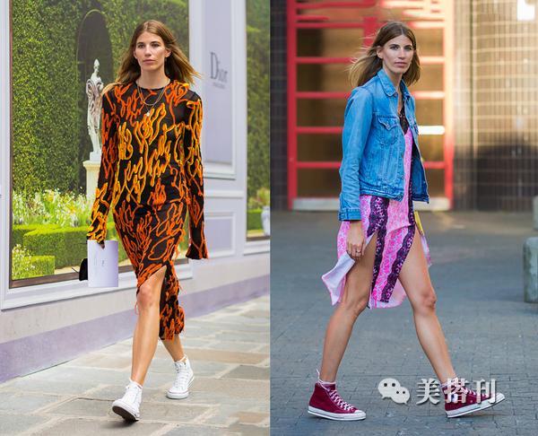 ▲当然,在搭配时帆布鞋与连衣裙颜色要协调,如果你穿一件深色连衣裙,那就来一双亮色帆布鞋,来增添层次感吧,同理若是你喜欢亮色连衣裙,一款简约黑色帆布鞋与之搭配也很不错,这样你穿起来才不会觉得花哨。