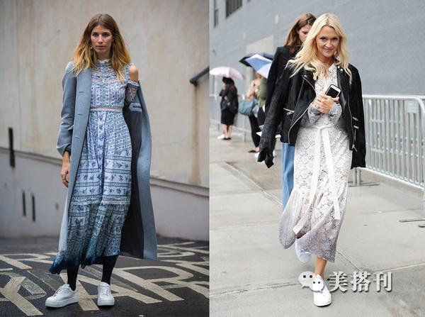 ▲小白鞋的百搭与灵活性很强,不管是帅气风格的连衣裙,还是很有女人味的连衣裙,小白鞋都能驾驭,网纱拼接裙摆让整件连衣裙透露着优雅与性感,小白鞋以及手拿包,都给整体加分,气场还用说吗。