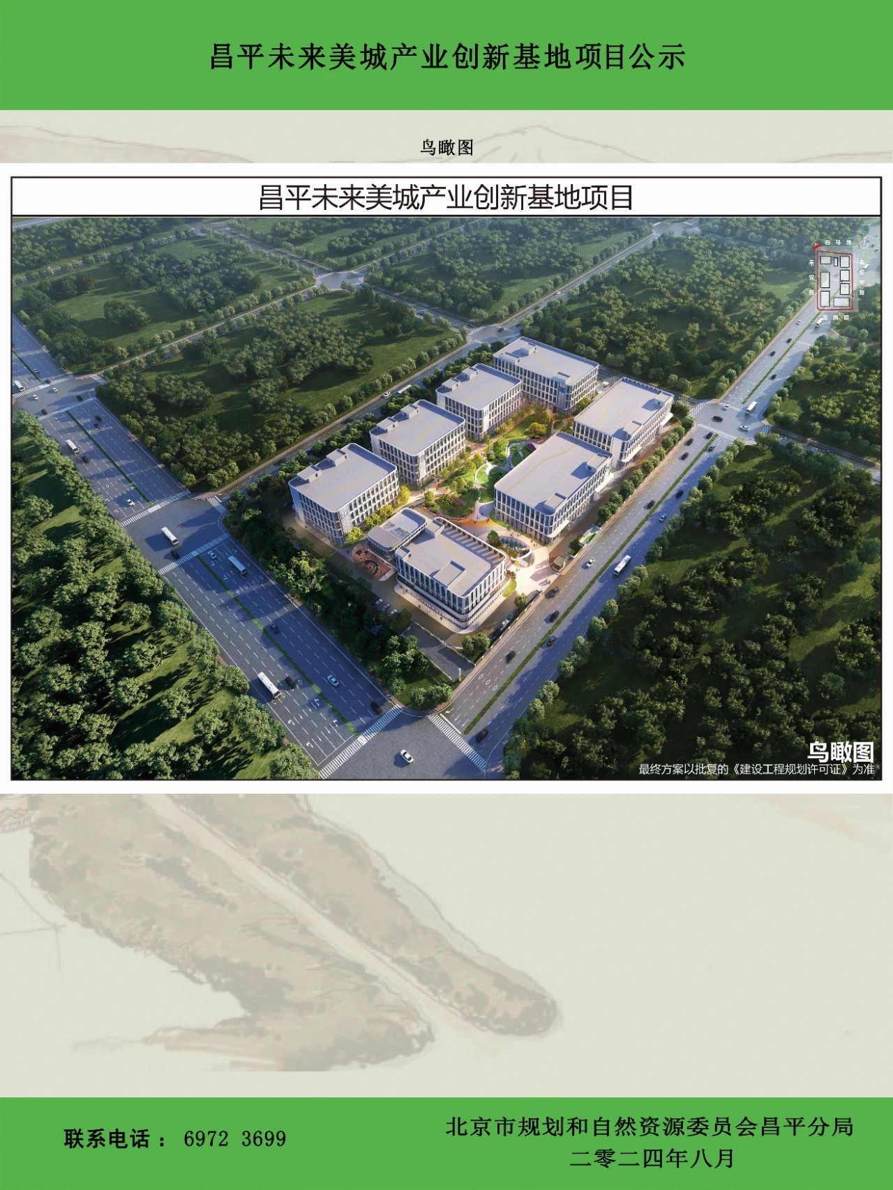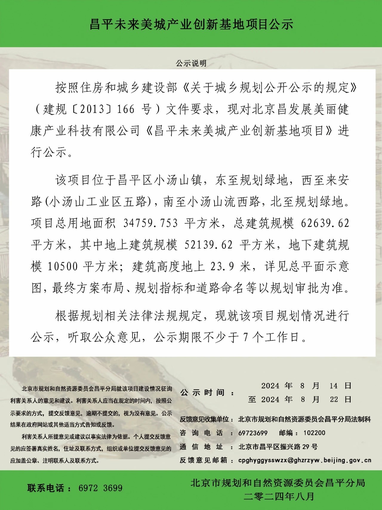 按照住房和城乡建设部《关于城乡规划公开公示的规定》 (建规〔2013〕166号)文件要求,现对北京昌发展美丽健康产业科技有限公司《昌平未来美城产业创新基地项目》进行公示。