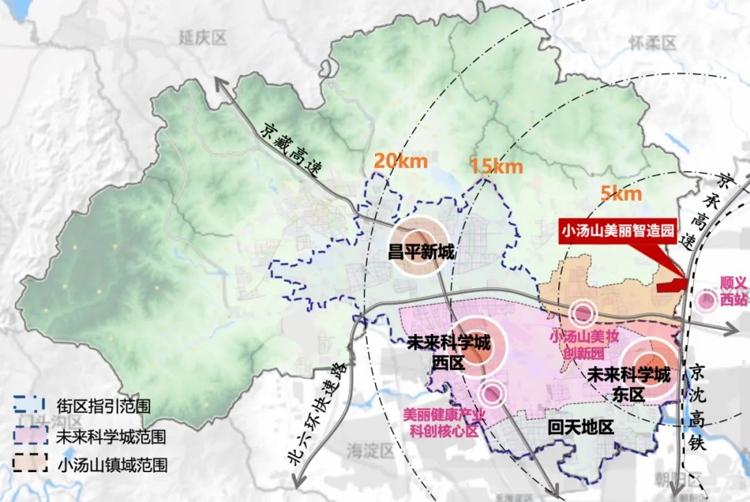 未来科学城科研成果转化基地(原小汤山镇工业区)位于未来科学城东区北部,紧邻京承高速和京沈高铁顺义西站,西为秦北路、南起顺沙路、北至白马路、东至昌平区界。