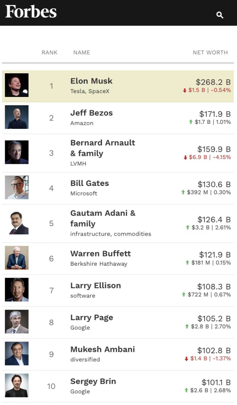 据福布斯实时亿万富豪榜(Forbes Real-Time Billionaires List),截至北京时间4月26日16:00,马斯克最新身家为2682亿美元(折合成人民币1.76万亿元),稳居世界首富宝座。