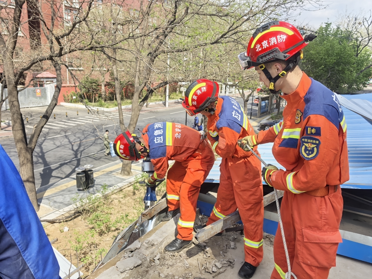 (记者 贾增远)4月12日13时44分,北京市消防救援总队指挥中心接群众报警,称海淀区太平路某平房彩钢板房顶发生脱落险情,需紧急救援处置。接警后,指挥中心立即调派海淀区采石路特勤站抢险救援编组(1车6人)火速赶赴现场。14时00分,救援力量抵达现场。经勘查,险情系太平路50号院北门西侧平房屋顶彩钢板被强风整体掀落,救援人员迅速携带破拆工具登顶作业,对松动彩钢板进行分段切割拆除。14时17分成功消除安全隐患。