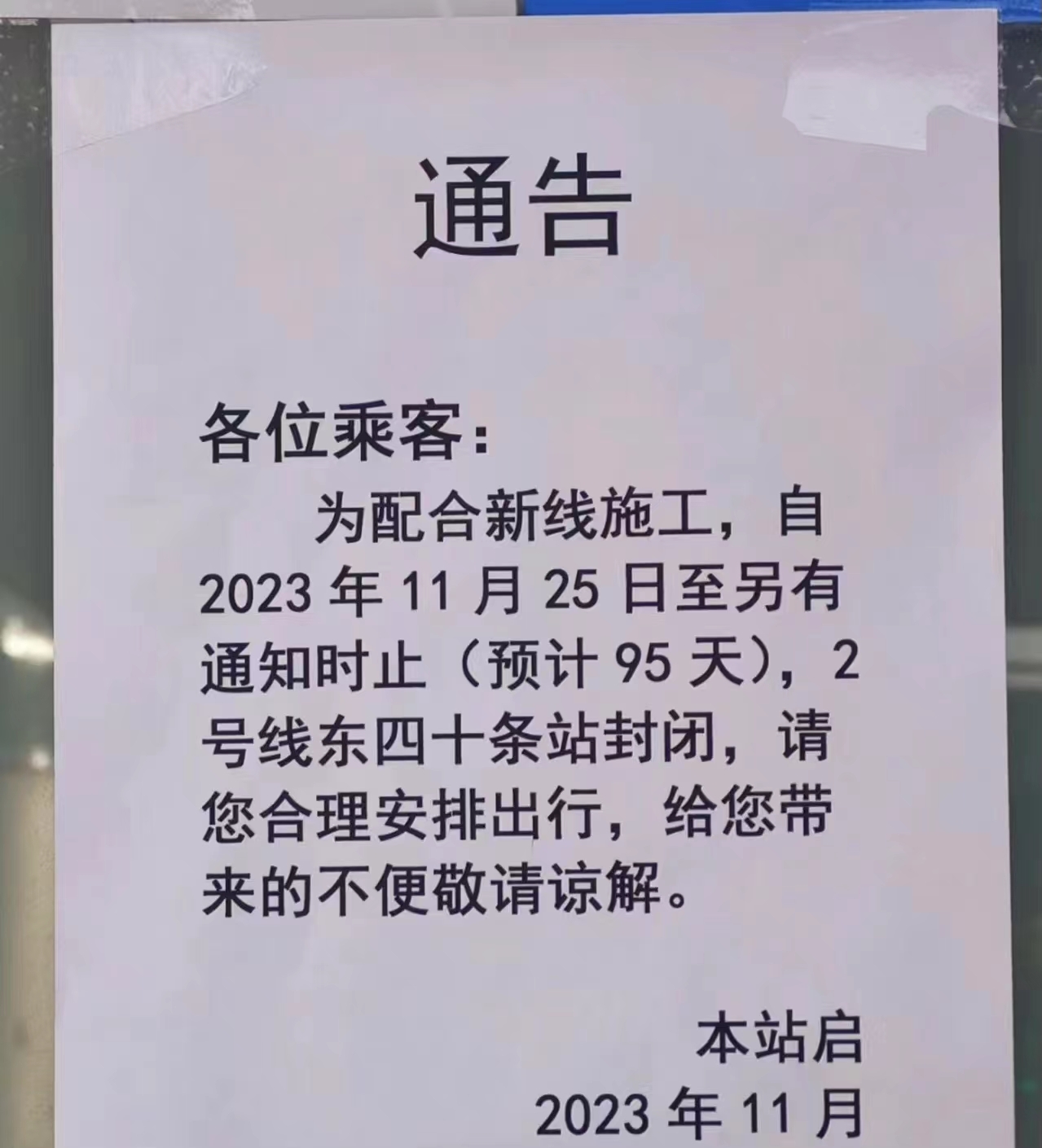 运营近40年的地铁东四十条站,本周即将迎来封站施工。今天,北京地铁发布通告:为配合地铁3号线施工,自2023年11月25日起至另有通知时止,2号线东四十条站封闭,施工工期预计为95天。