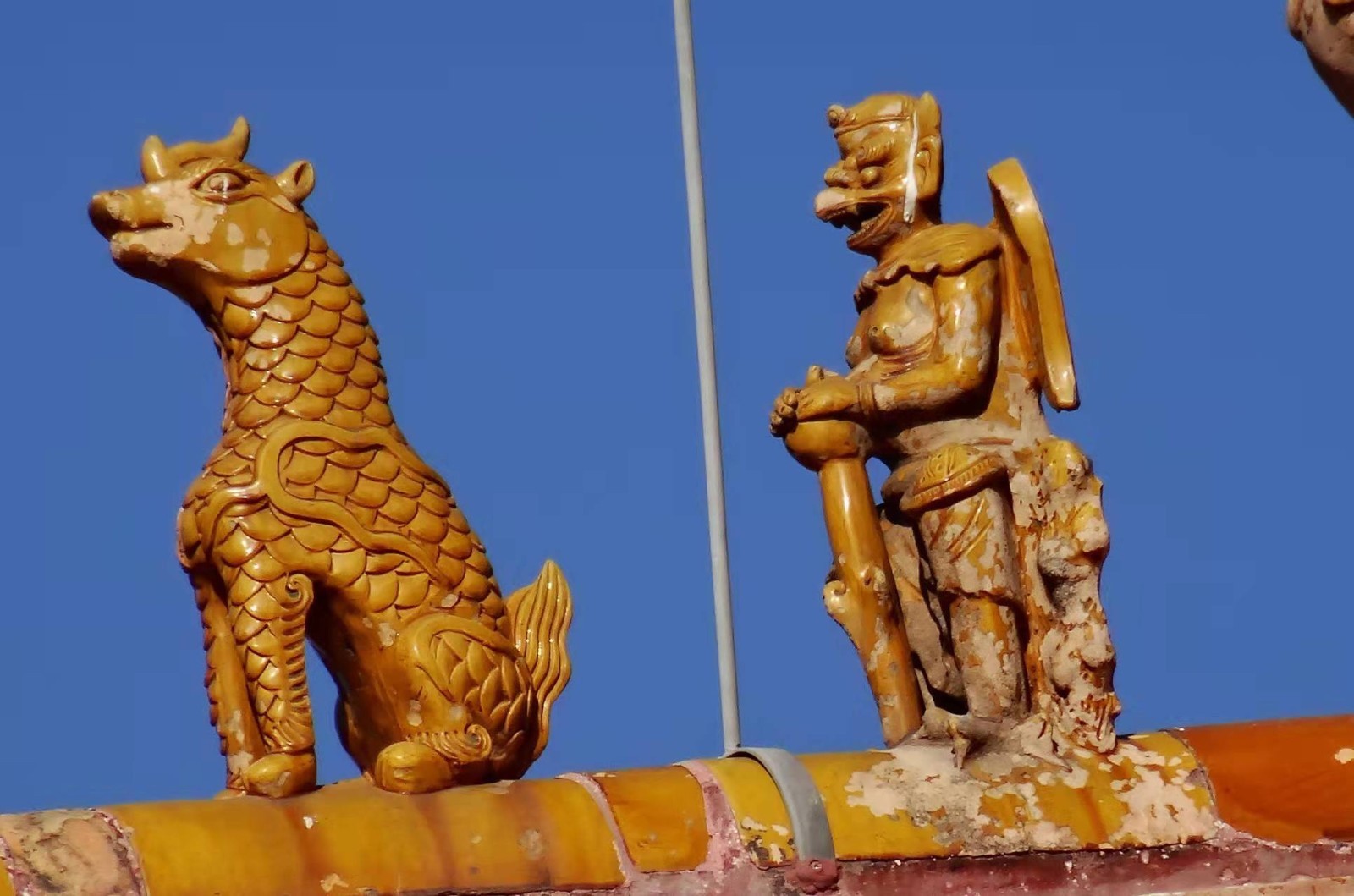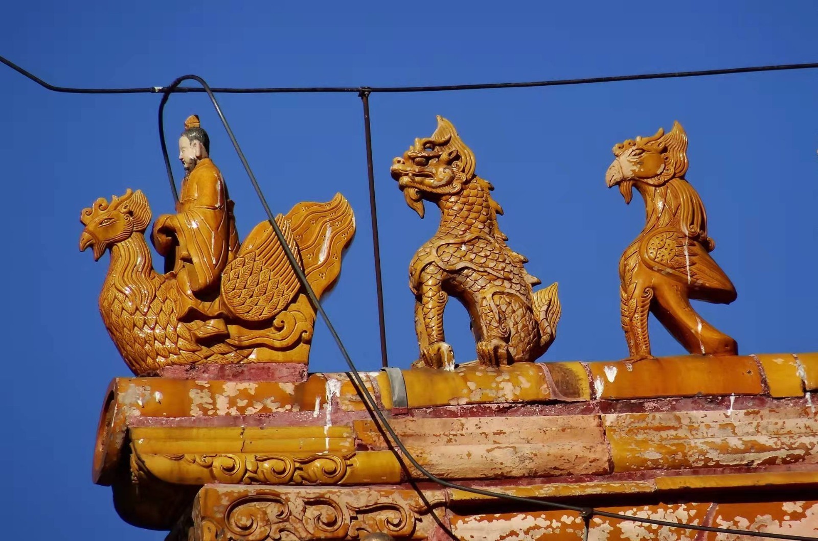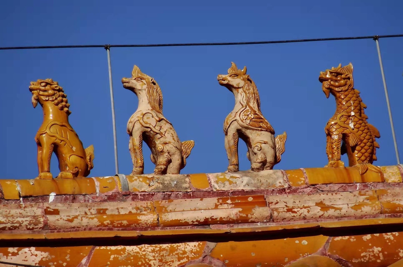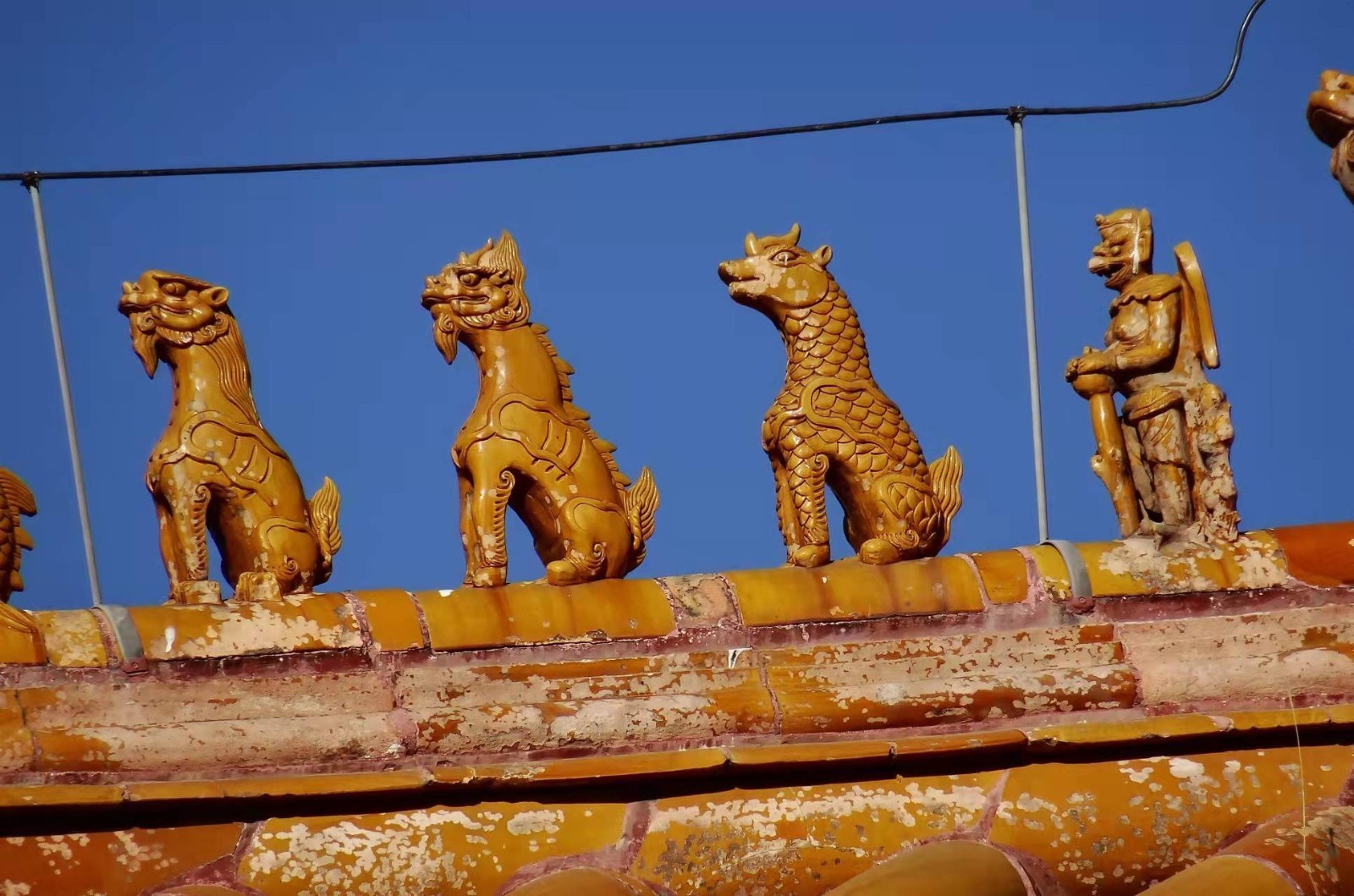 屋脊兽是中国古代传统建筑中放置在房屋、宫殿等房脊上的雕塑作品。古建筑上的跑兽最多有十个,分布在房屋两端的垂脊上,古人把建筑装饰上这些走兽,使古建筑更加雄伟壮观,富丽堂皇,充满艺术魅力。