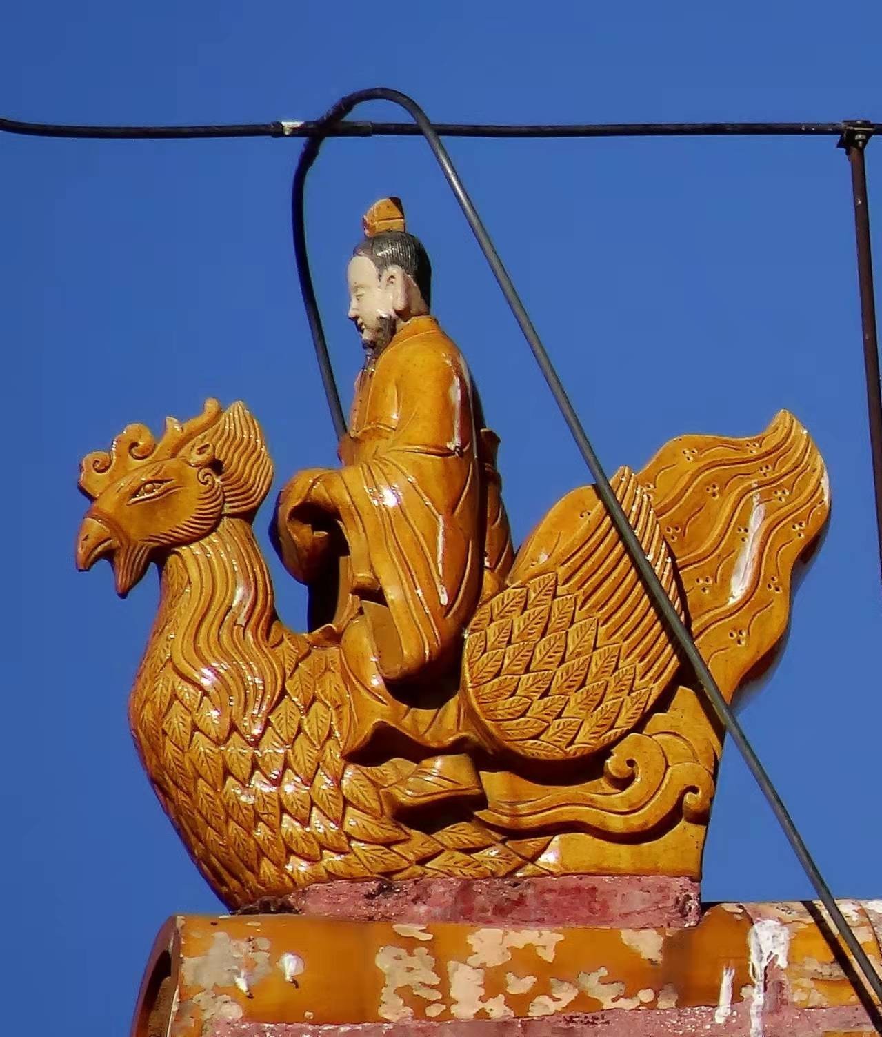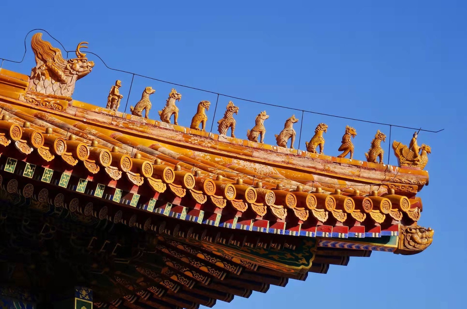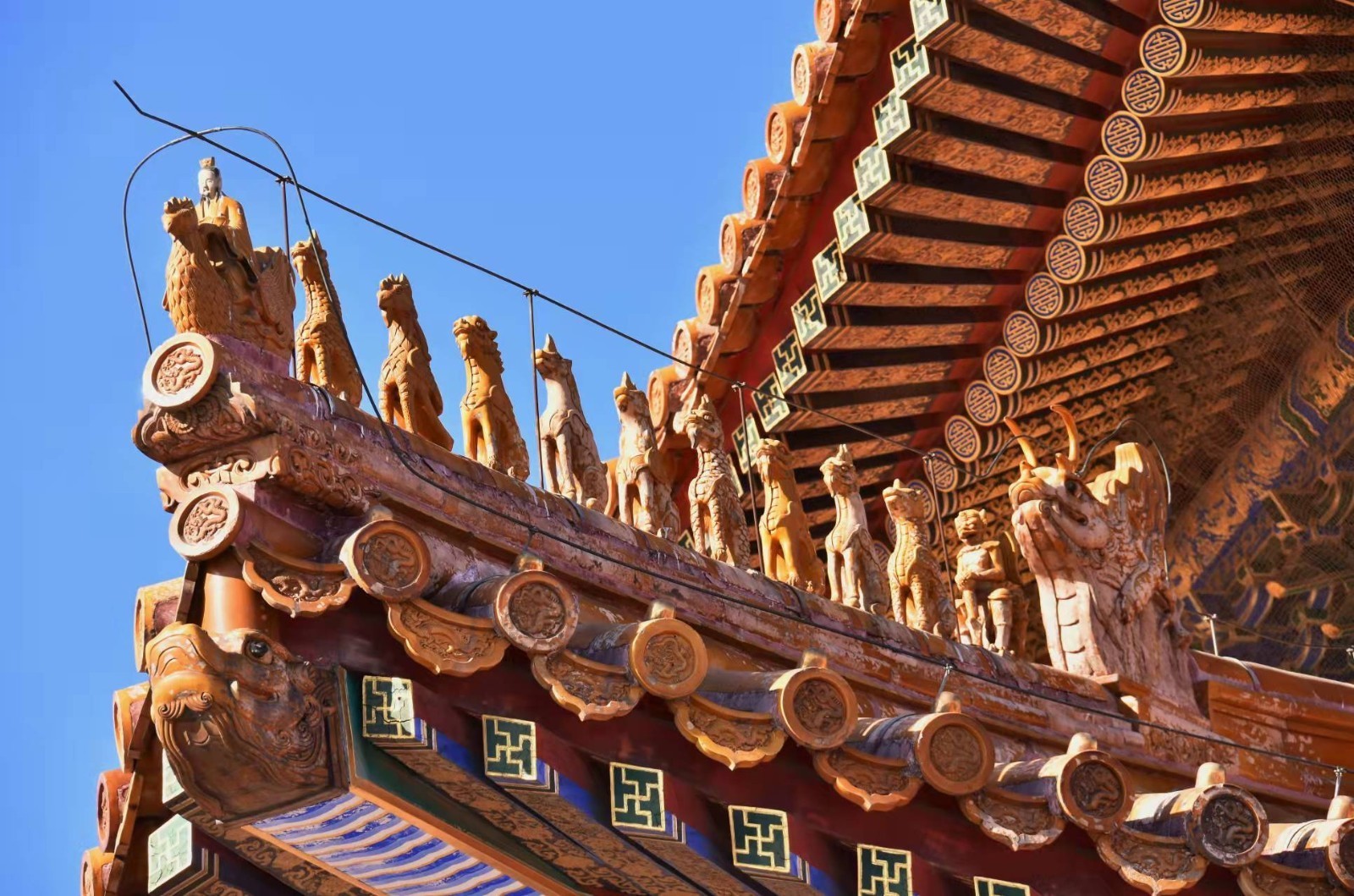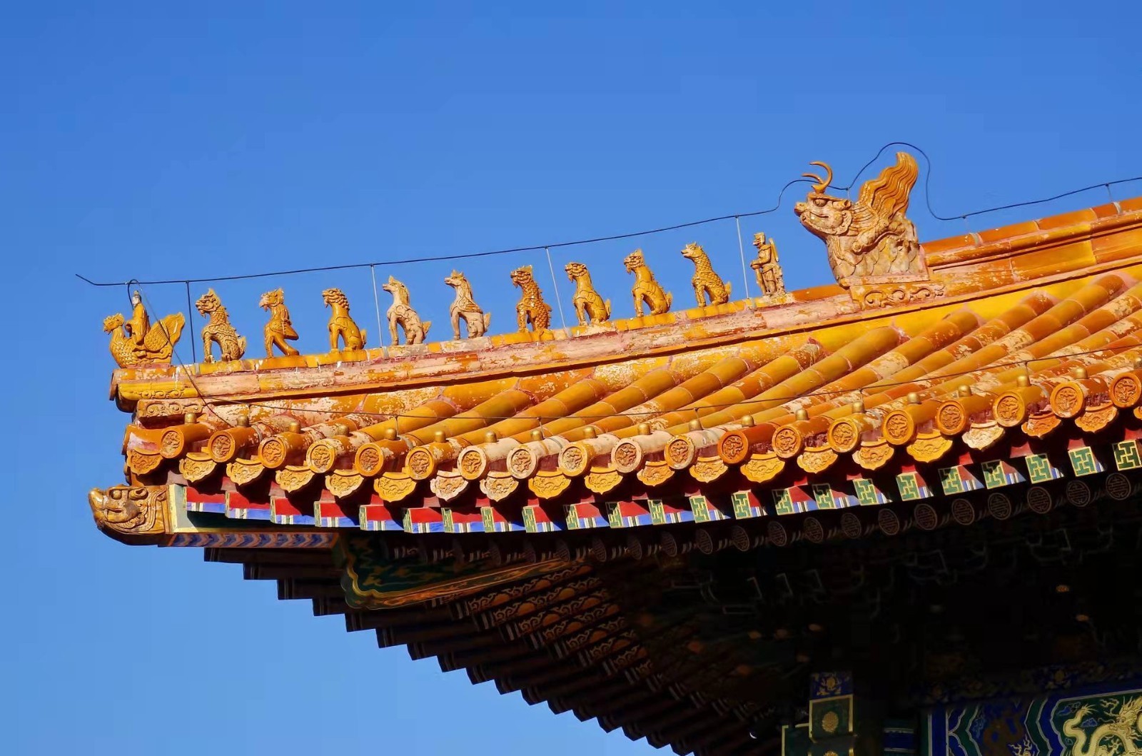 屋脊兽是中国古代传统建筑中放置在房屋、宫殿等房脊上的雕塑作品。古建筑上的跑兽最多有十个,分布在房屋两端的垂脊上,古人把建筑装饰上这些走兽,使古建筑更加雄伟壮观,富丽堂皇,充满艺术魅力。