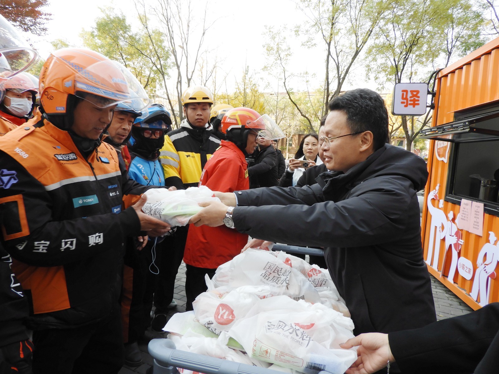 启动仪式后,出席领导共同为骑手小哥们送上一份“冬日暖心包”。每份暖心包内配备暖宝贴、发热足贴、护手霜、红糖姜茶及服务手册等七类物资,并贴心地为女骑手增配卫生用品,尽显人文关怀。