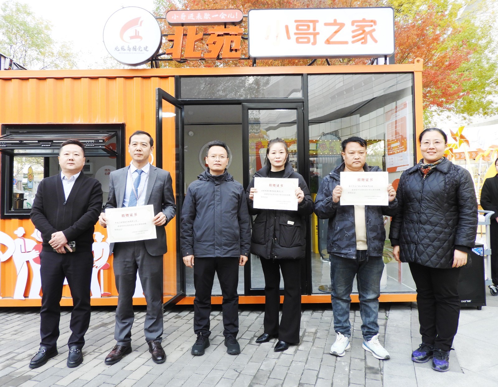 现场,出席领导为万达广场商业管理有限公司、通州万达广场小黄鸭城市乐园、北京徽鱼坊餐饮服务有限公司等捐赠企业颁发证书,感谢他们对“北苑小哥之家”建设的大力支持。