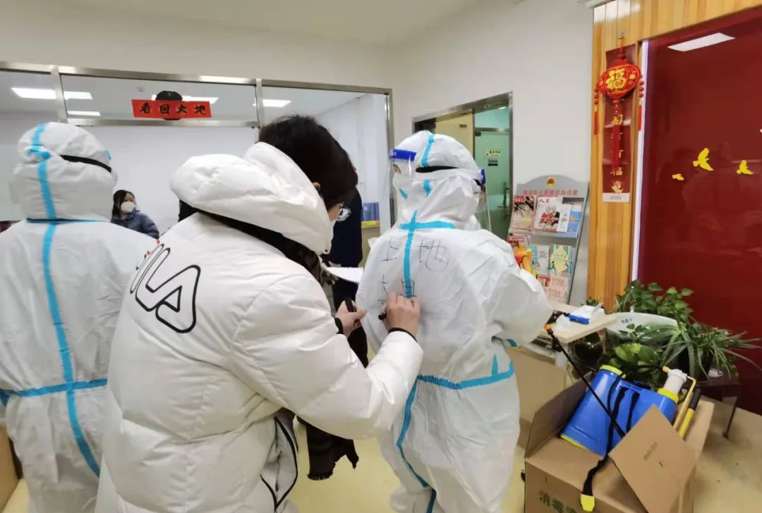同时,新一批赶来支援的医护人员穿上防护服,准备入户为行动不便的居民进行入户核酸检测采样。