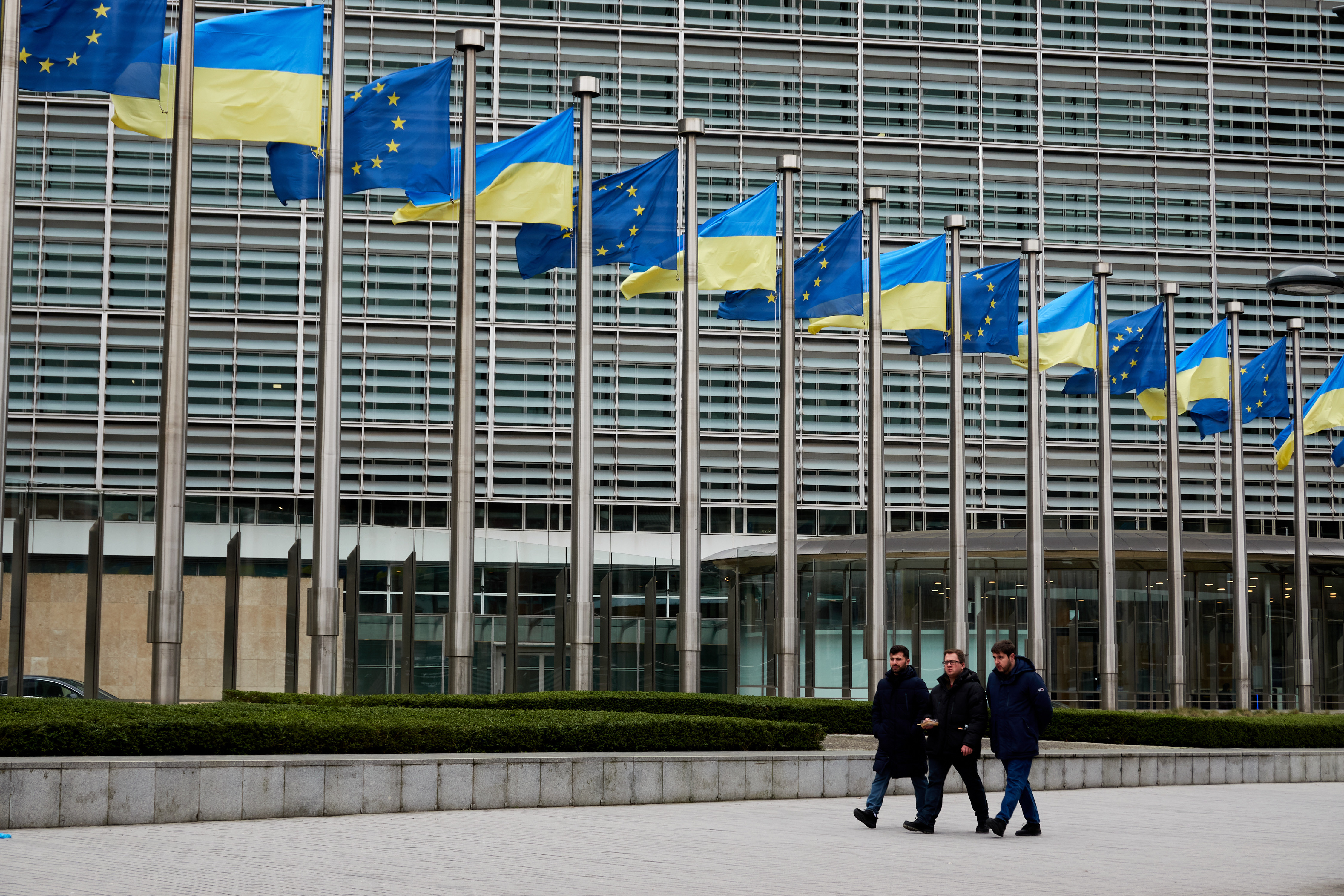 ▲2025年2月24日,在比利时布鲁塞尔,人们走过欧盟总部。新华社记者孟鼎博摄