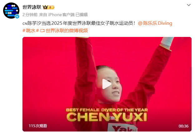 世界泳联在官方微博宣布,陈芋汐当选2025年度世界泳联最佳女子跳水运动员。值得一提的是,陈芋汐还入选了2026劳伦斯世界体育奖最佳女运动员提名名单,成为本届评选中唯一入围的中国运动员。