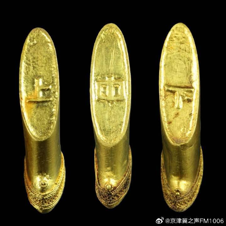 褭蹏金(俗称“马蹄金”)此外,展览中展出的褭蹏金(俗称“马蹄金”)与麟趾金,以花丝镶嵌工艺铸就,其底部“上”“中”“下”铭文暗藏等级秩序。通俗地说,褭蹏金、麟趾金是汉武帝时代象征祥瑞的特制纪念币,常被用于赏赐亲信或功臣。
