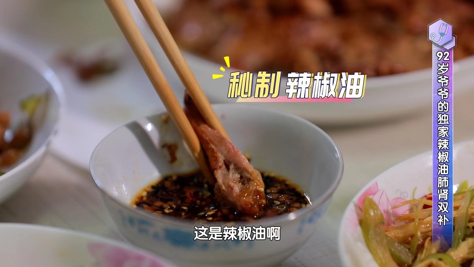 在饮食上非常讲究的赵爷爷,日常调料也充满智慧。一道干香浓厚的辣椒油肺肾双补,它由五种营养食材制作而成,分别有芝麻、花生米、核桃、辣椒面、大蒜。其中,核桃有补肾润肺作用,芝麻可以养血润燥,这就缓解了辣椒的辛燥之性,同时还能肺、肾双补,简直就是辣椒油最强王者。