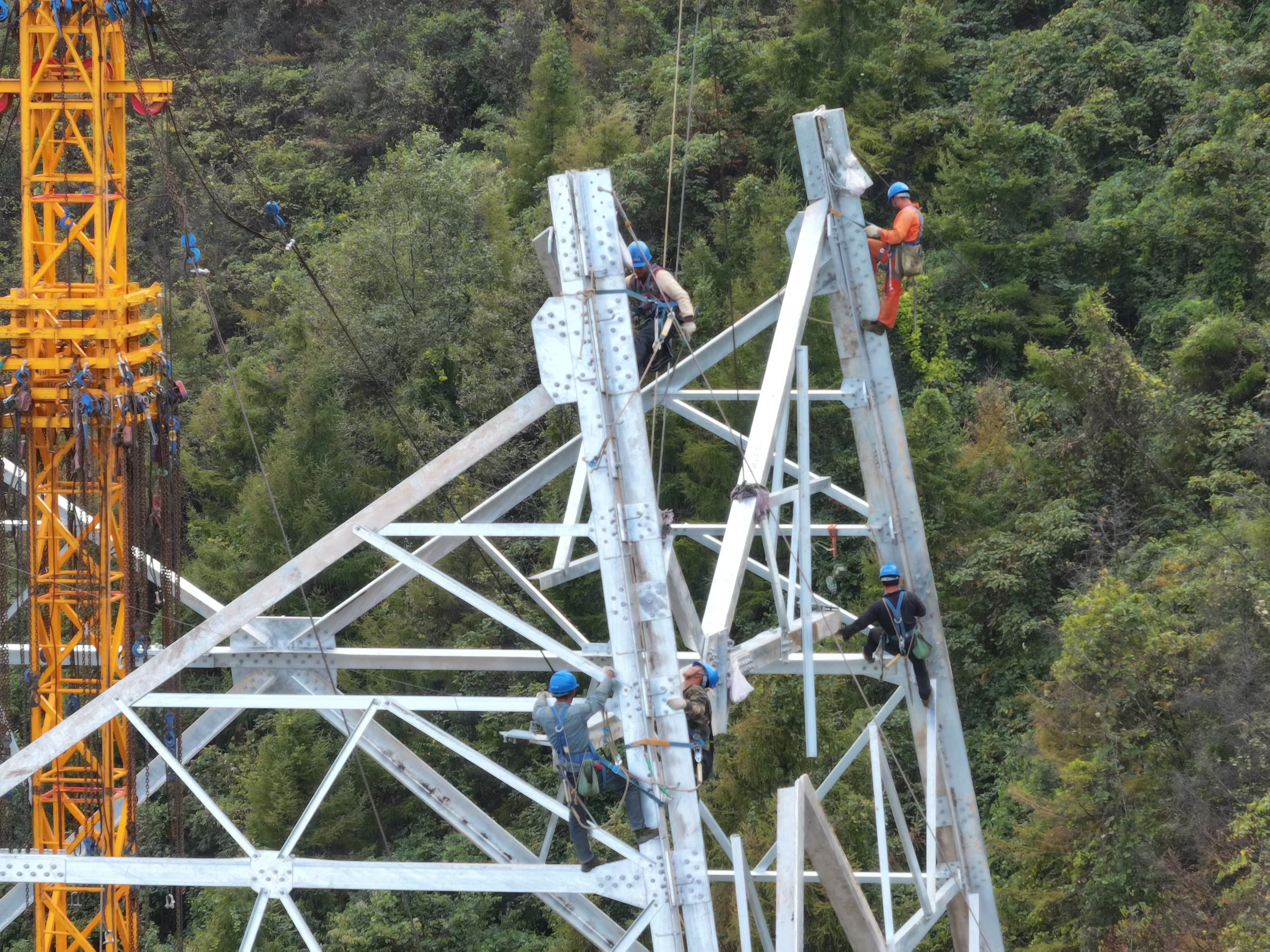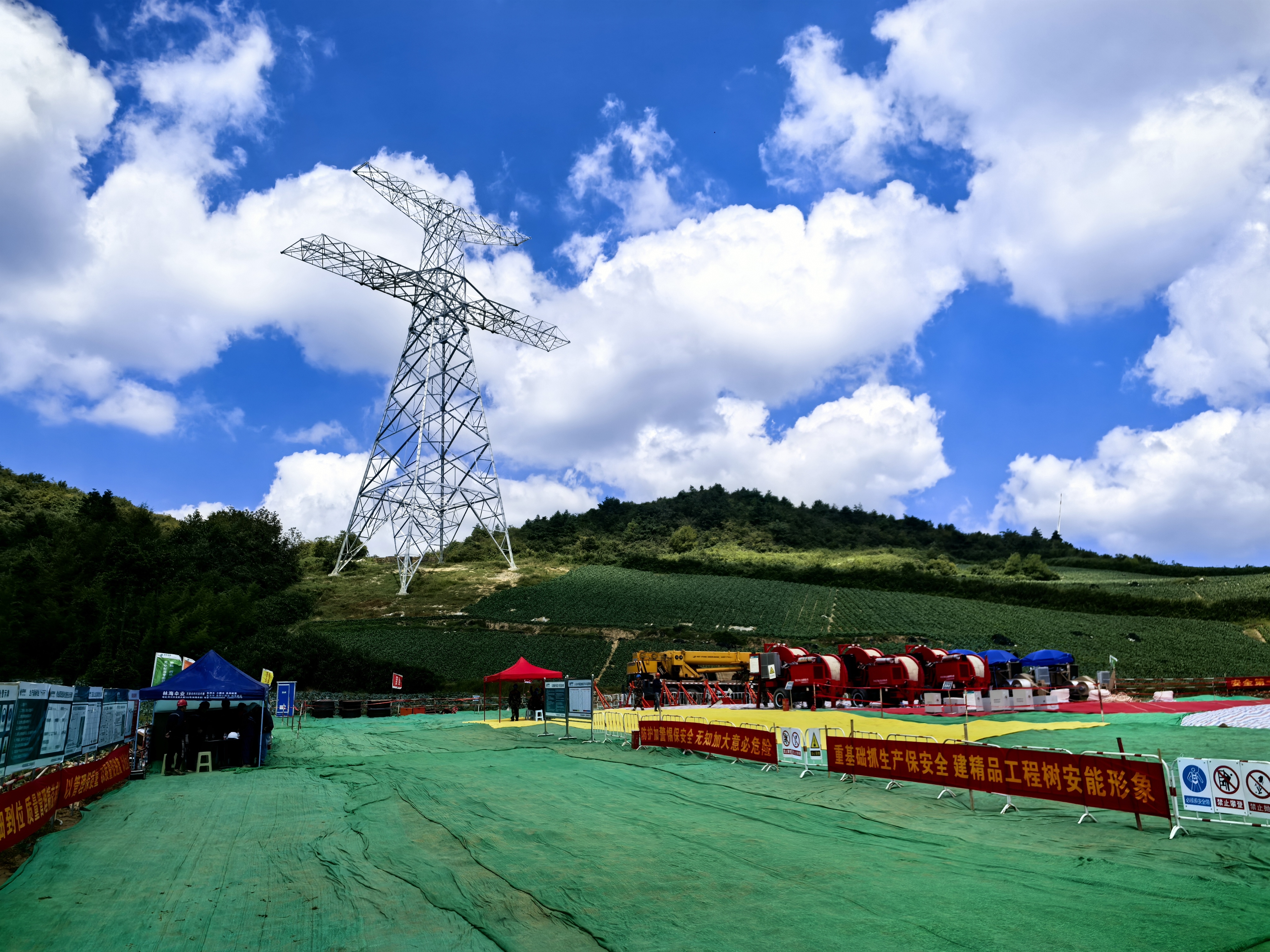 组塔施工阶段,由于施工区域多为山区,80%的塔位必须采用落地式摇臂抱杆组塔,施工效率低、安全风险大。特别是N5735、N5733塔位作为“最硬的骨头”,可用作业面坡度近50°,且道路崎岖、地势陡峭,工人徒步上山需1个小时以上。在艰难面前,项目部科学统筹,组织对重要工器具、抱杆垂直度等进行详细检查,更换使用环式手板葫芦,用于主要受力位置,消除钩式手扳葫芦存在的脱钩隐患,提高机具安全性能;指定专人负责塔材运输、塔材堆放及组装,组立完成后对铁塔倾斜度进行重点检测;施工现场除布置布控球监控外,还采购配备执法记录仪,记录重要组塔吊装全过程,全面掌控现场安全施工。