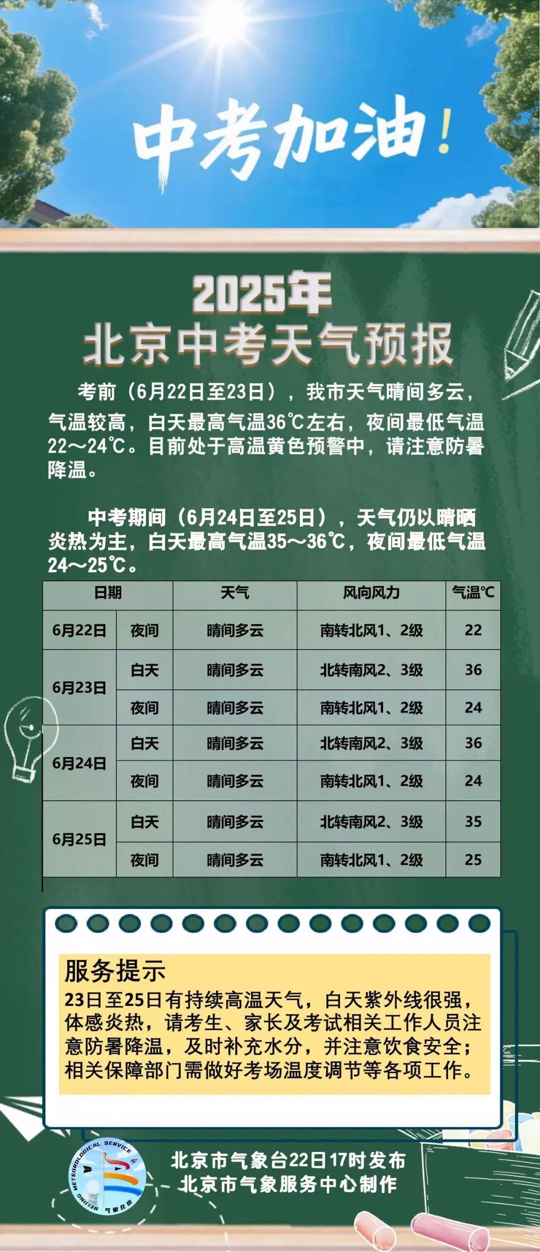 气象部门预计中考期间(6月24日至25日),天气仍以晴晒炎热为主,白天最高气温35~36℃,夜间最低气温24~25℃。