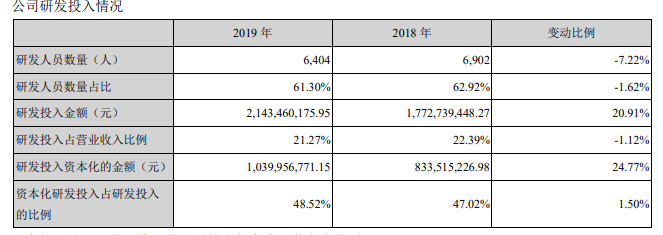 作为技术型企业,2019年科大讯飞的研发投入为21.43亿元,同比去年增长21.27%;当期研发费用16.4亿元,相当于营收的16.2%。但值得注意的是,研发投入和研发费用增长的同时,科大讯飞研发人员数量却从2018年的6902人降至6404人,同比下降7%,对于依赖人才的AI行业来说这一现象并不寻常。