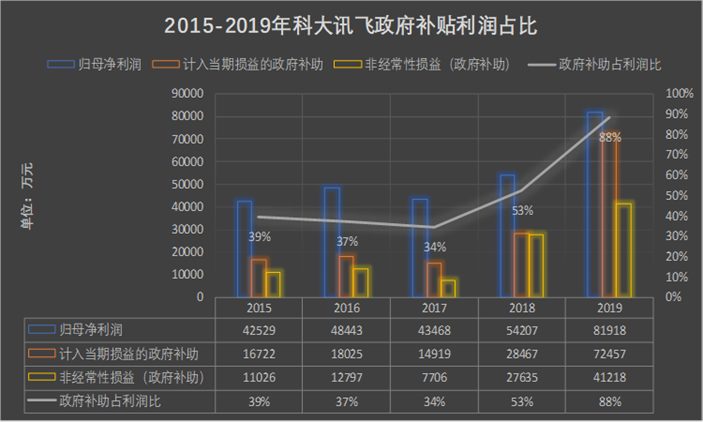 近年来,科大讯飞对政府补助的依赖不断引起外界对其盈利能力的质疑。从其2019年的财务数据来看,科大讯飞的利润依然高度依赖政府补助。