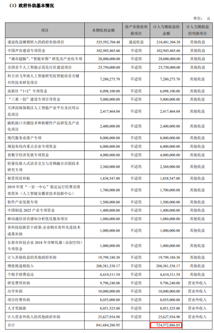 如上图所示,2019年科大讯飞计入当期损益的政府补助为7.24亿,其中4.12亿为非经常性损益,分别相当于当期利润的88.4%和50.3%。
