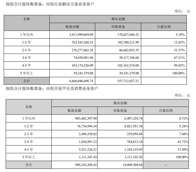 按照应收账款的类型来看,科大讯飞按照业务将客户分成“行业解决方案客户”和“开放平台及消费业务客户”。如上图所示,约占营收总额1/3的开放平台和消费者业务的应收账款余额只占到全部应收账款的18%,坏账比例也相对较低;但科大讯飞营收的核心,占总营收近2/3的行业客户,不仅付款周期更长,坏账比例也要更高。