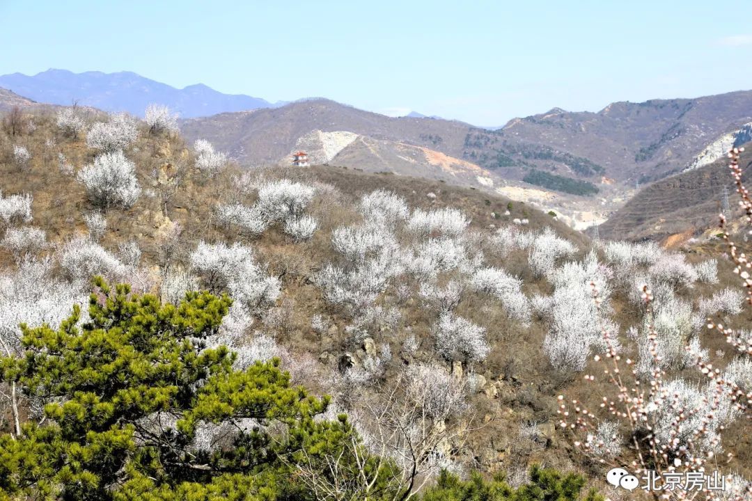 山间小径蜿蜒,桃林与青松、翠柏相映成趣。登高俯瞰,整片山谷宛若一幅水墨丹青,粉白的花海与碧空、远山交织,恍若闯入桃源秘境。