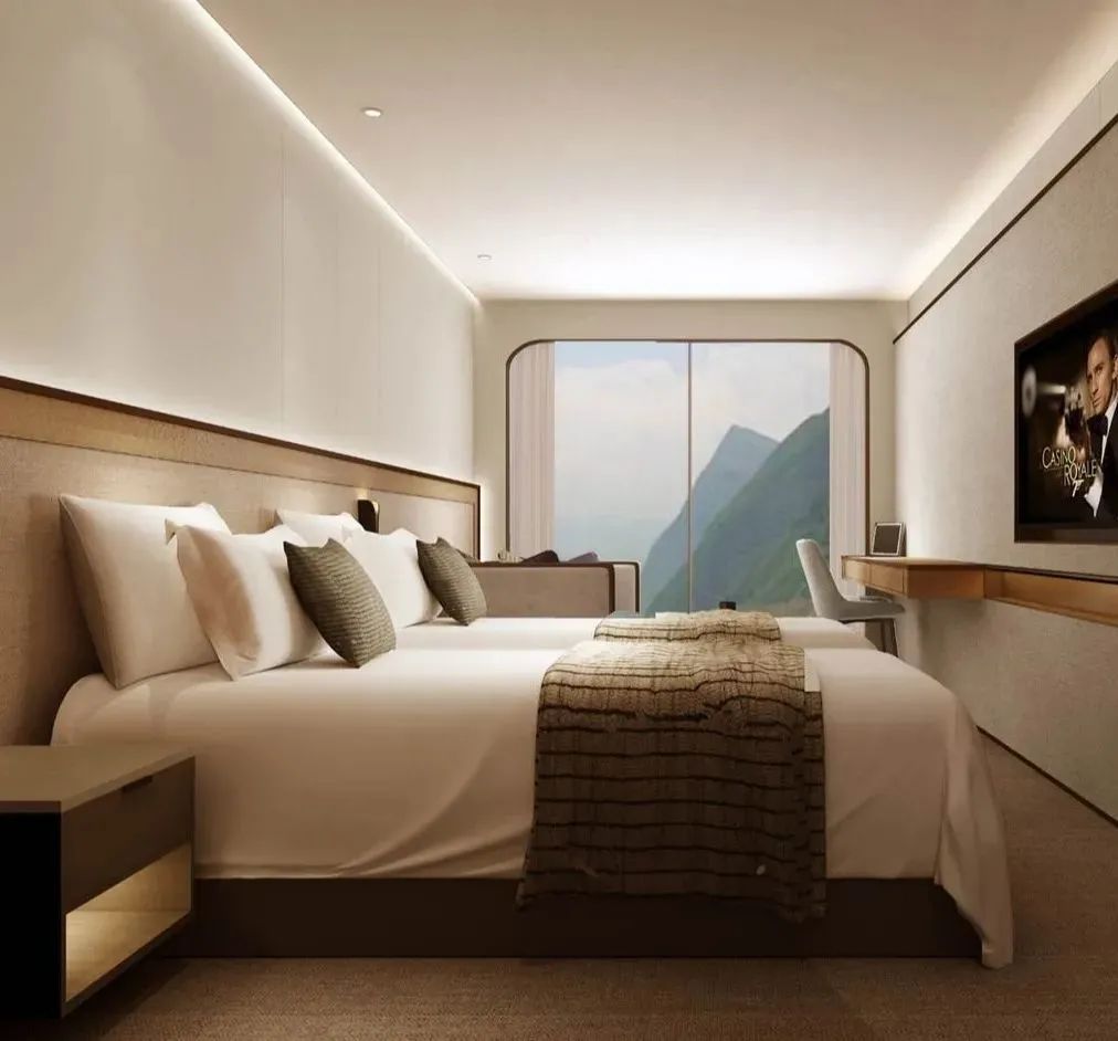 全江景豪华客房,26平米私人观景大阳台,卫生间干湿分离。客房独立进排风,互不循环,配置光氢气离子空气净化系统,被称为引进了防疫装置的“免疫船”。