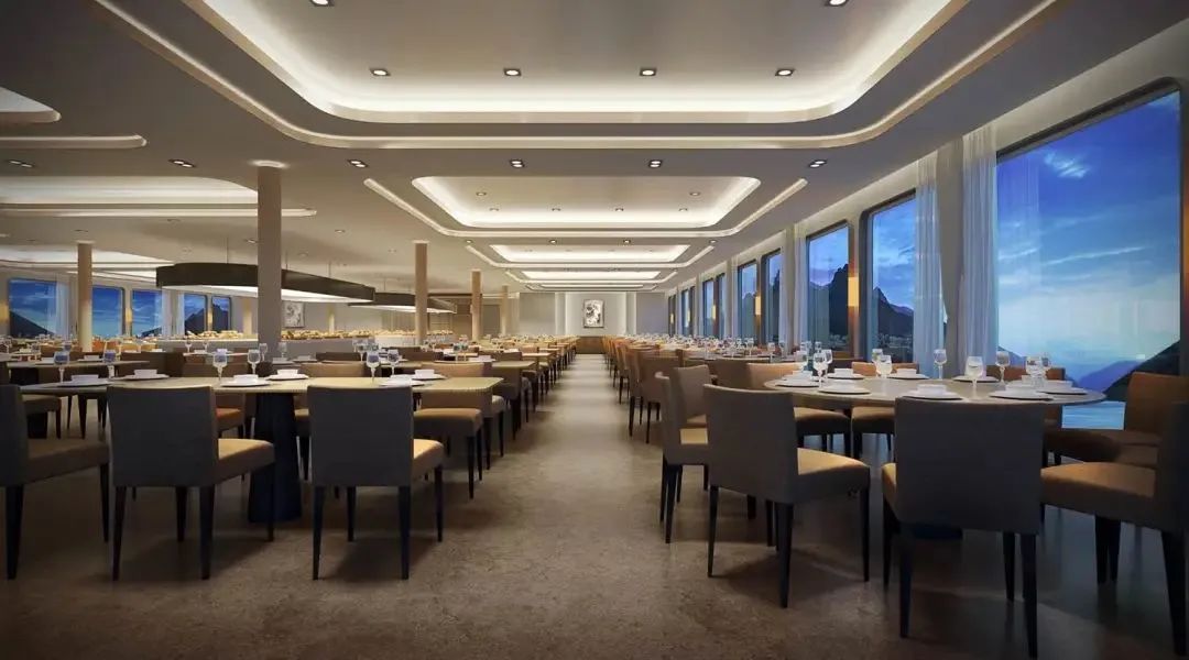 宽大透亮的主餐厅拥有全景落地窗。五星游轮上全部为丰盛的中西自助餐,您可尽情品尝长江沿岸的特色风味美食。