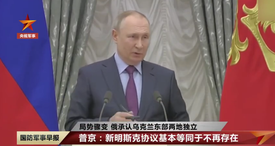 22日,俄罗斯总统普京对记者表示,俄方过去有意愿执行新明斯克协议,但西方无力促使乌克兰执行该协议,使其基本沦为一纸空文,俄罗斯被迫做出承认“顿涅茨克人民共和国”和“卢甘斯克人民共和国”独立的决定。他还表示,俄罗斯将向这两个“共和国”提供军事援助。