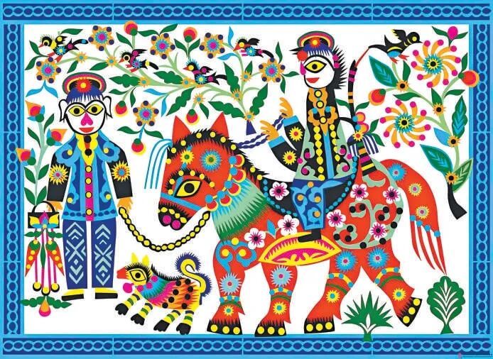 剪纸艺术大师库淑兰剪纸作品《江娃拉马梅香骑》
