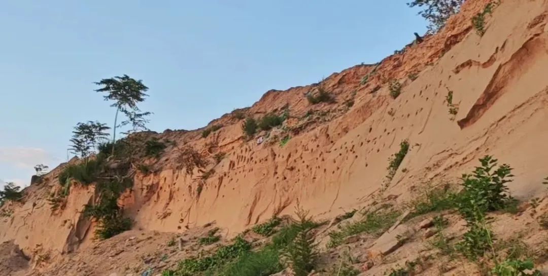 这片土崖长30多米,高近20米,不时有褐色的崖沙燕从巢穴处飞进飞出。崖沙燕属于有着重要生态、科学和社会价值的“三有”陆生野生动物。