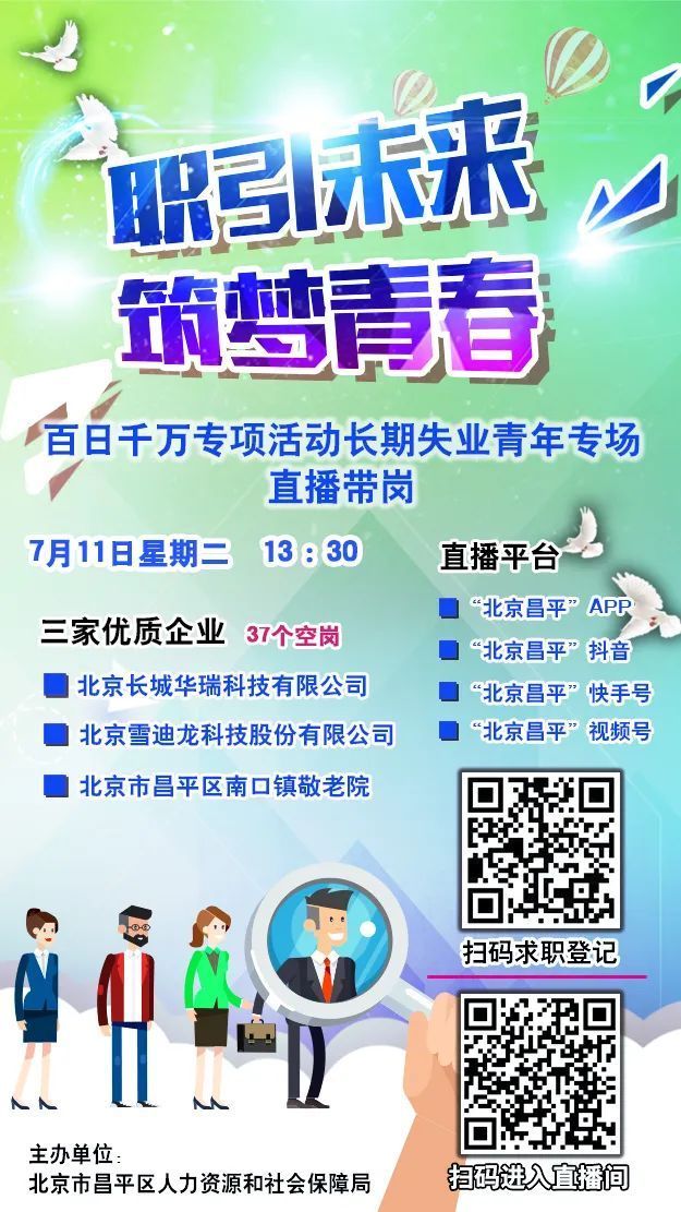 7月11日下午2:00,昌平区公服中心将举办以“职引未来 筑梦青春”为主题的百日千万专项活动长期失业青年专场直播带岗。届时,将有北京长城华瑞科技有限公司、北京雪迪龙科技股份有限公司、北京市昌平区南口镇敬老院3家优质企业携自动化工程师、嵌入式硬件工程师、售前技术支持、空调工、办公室助理、护理员等37个空岗直播间云端纳才。