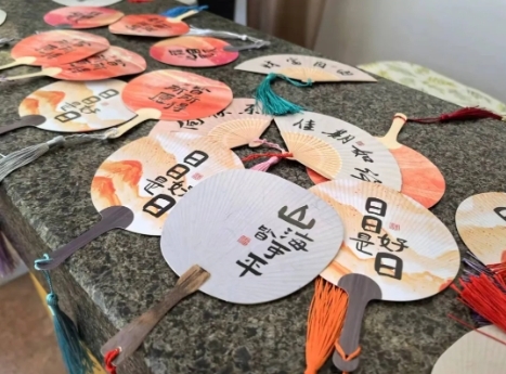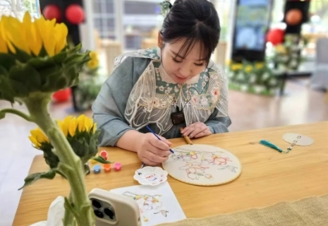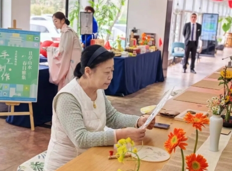 本届明文化节的衍生活动“春日雅集”在且亭山水酒店举行,集市上古风十足,游客或是身着明朝服饰画扇面,或是在仔细挑选明文化主题小物件。
