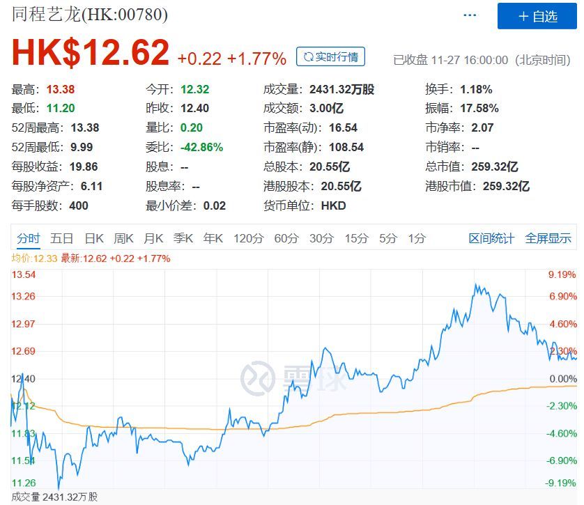 最新消息,截至11月27日收盘,同程艺龙涨1.77%,股价为12.62港元/股。总市值259.32亿港元。