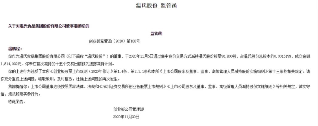 对此,温氏股份方面回复时间财经称,公司董事减持公司股票系其本人误操作所致。为此,其本人已向交易所进行了专项说明,并自举了相关证据,得到了交易所的采纳,遂收到以上函件。