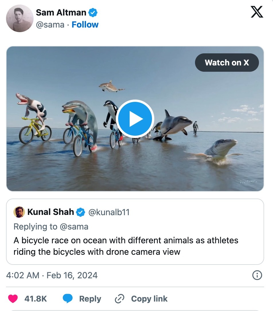 OpenAI CEO奥特曼在社交平台发布Sora视频。