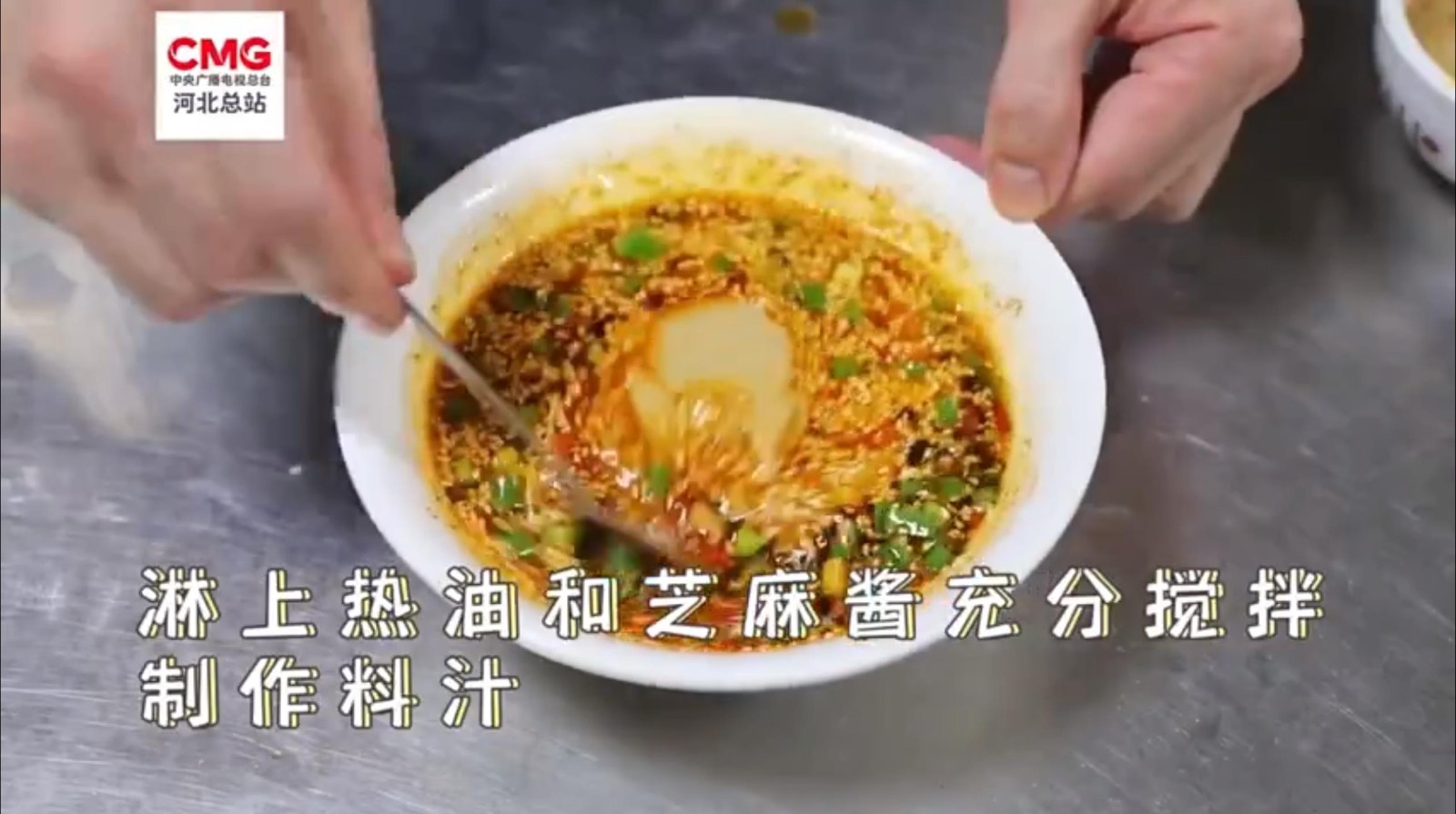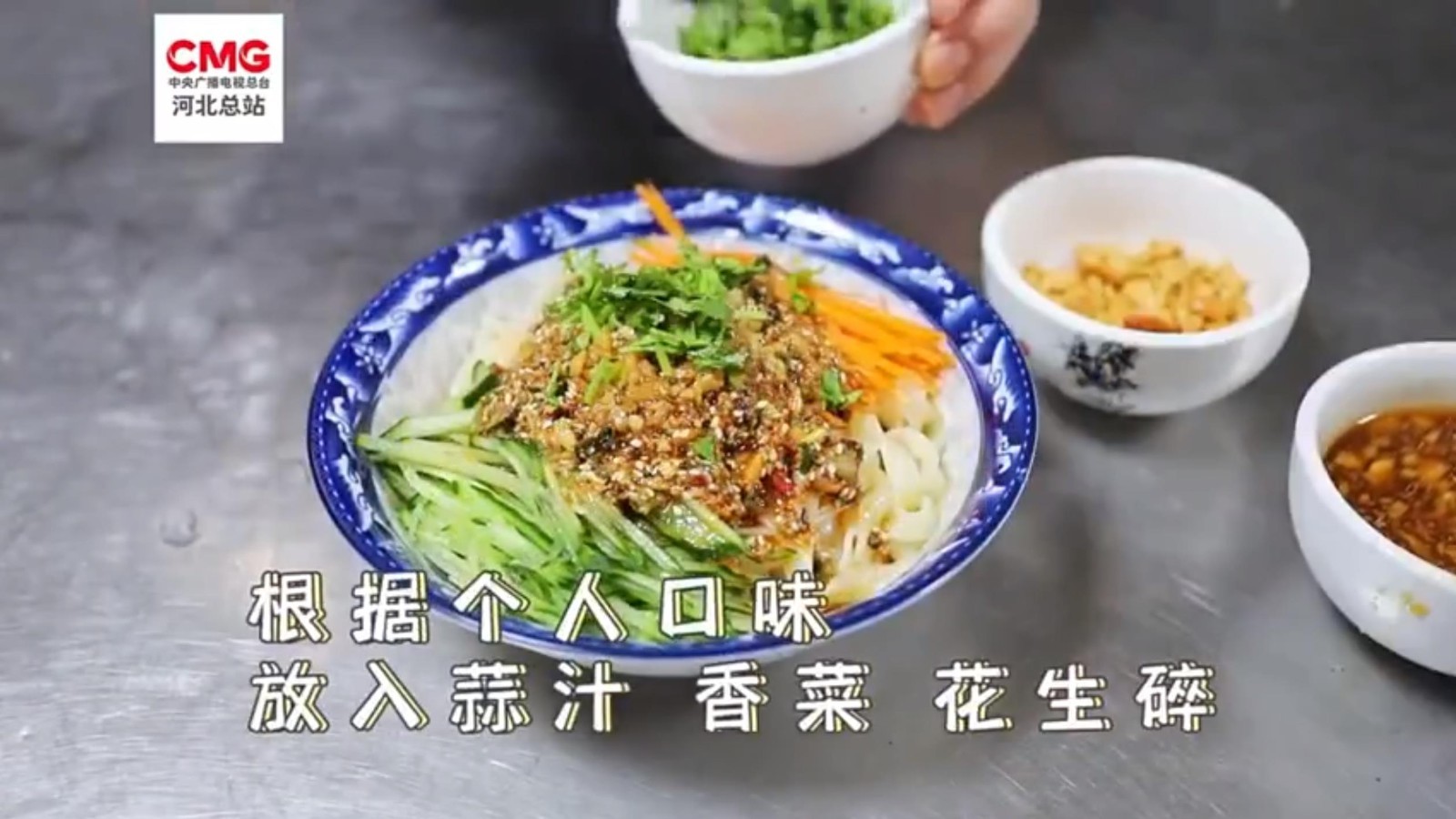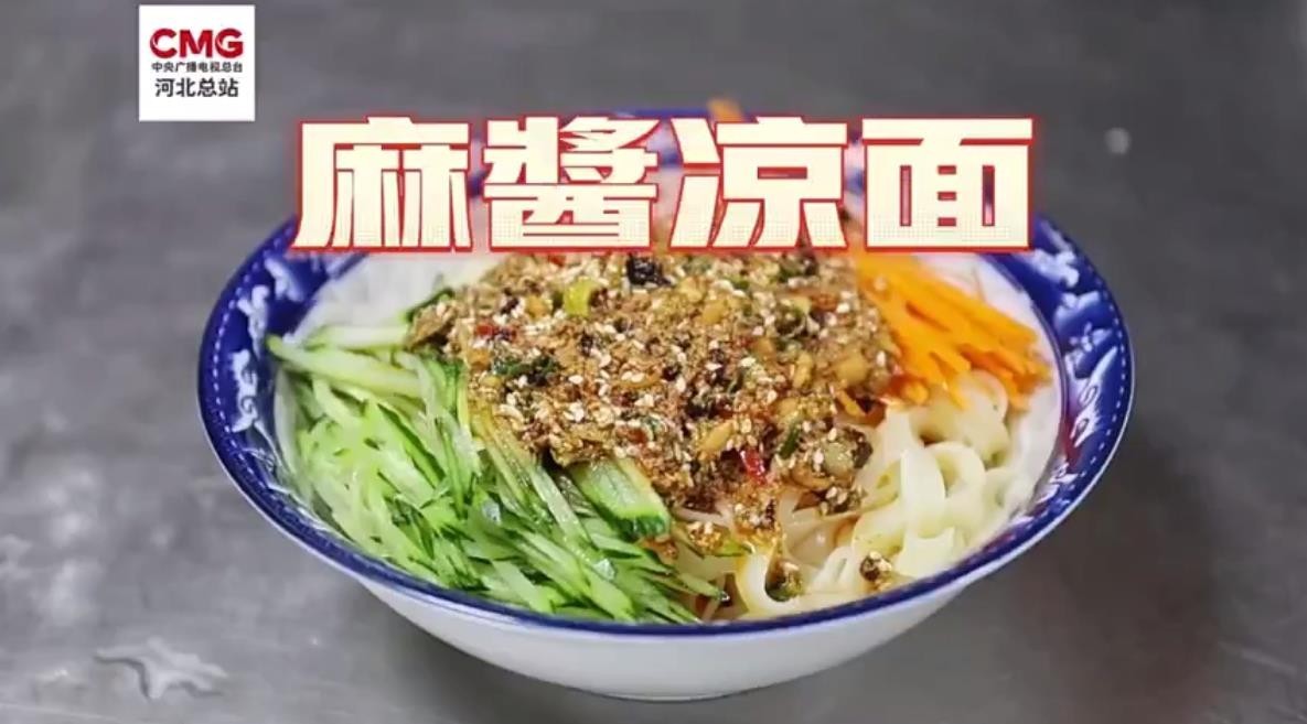在河北省大名县,麻酱凉面是当地人夏季必做的美食。料碗中放入芝麻、五香粉、花生碎、辣椒粉等,淋上热油和芝麻酱充分搅拌,再将做好的酱汁浇在面上,一碗麻酱凉面味道香醇,好吃且易上手。