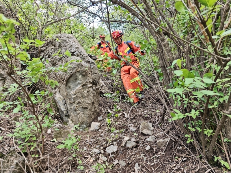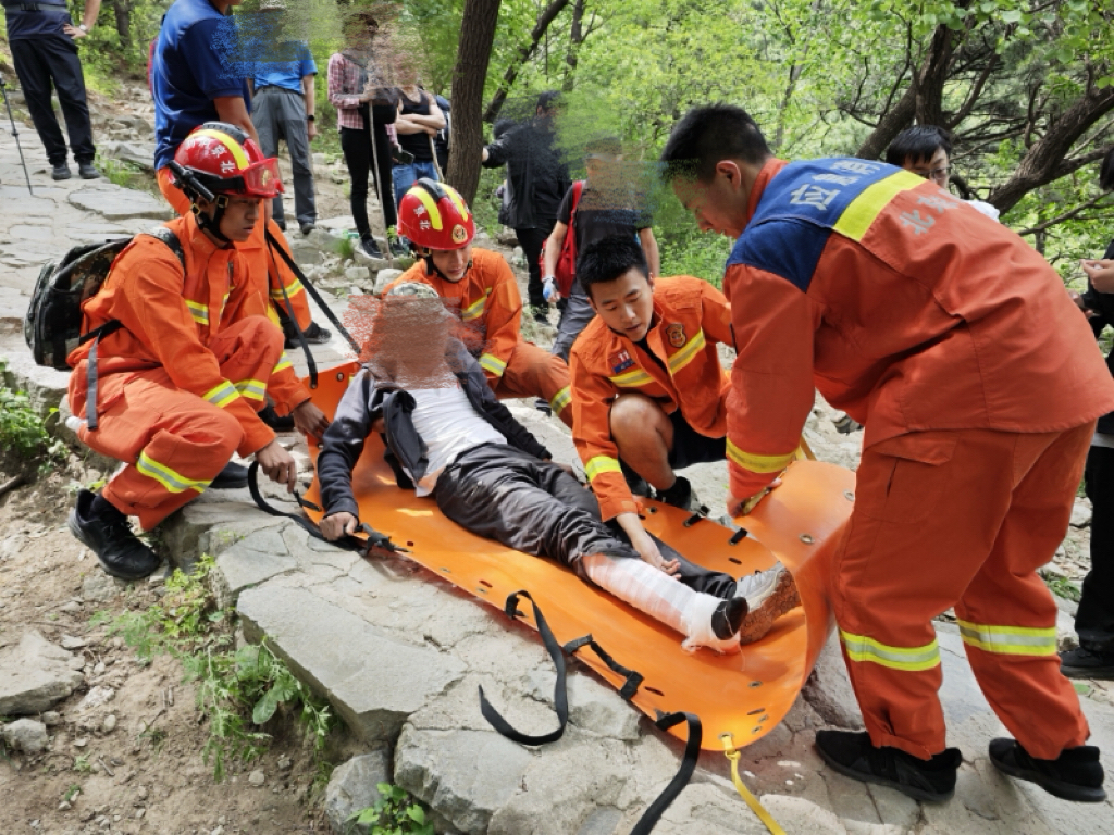 5 月 18 日 11 时 42 分,北安河消防救援站再次接到报警,一名男性游客在上山途中不慎滑倒,腿部受伤无法行动。救援人员携带绳索、急救箱、多功能担架等装备迅速出动,抵达现场后发现,伤者位于海拔 600 米的一处陡坡,经初步检查为腿部骨折,无法自行移动。