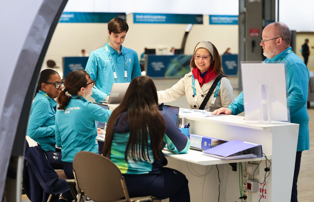 1月28日,工作人员在2026年米兰-科尔蒂纳冬奥会主媒体中心服务台与访客交流。新华社记者 杜潇逸 摄