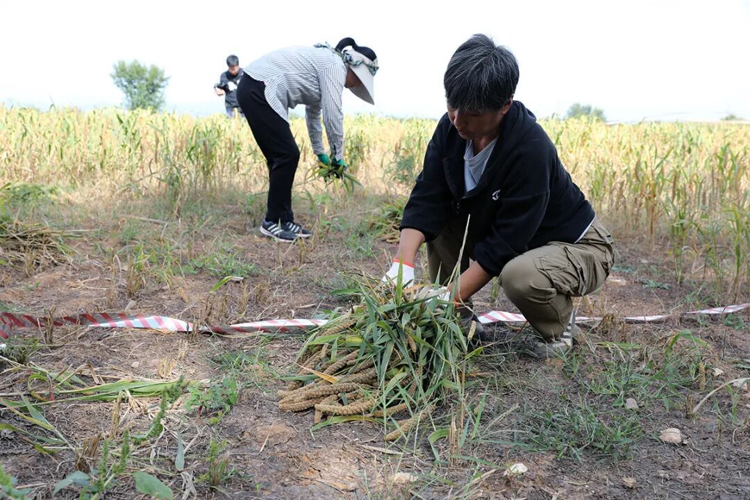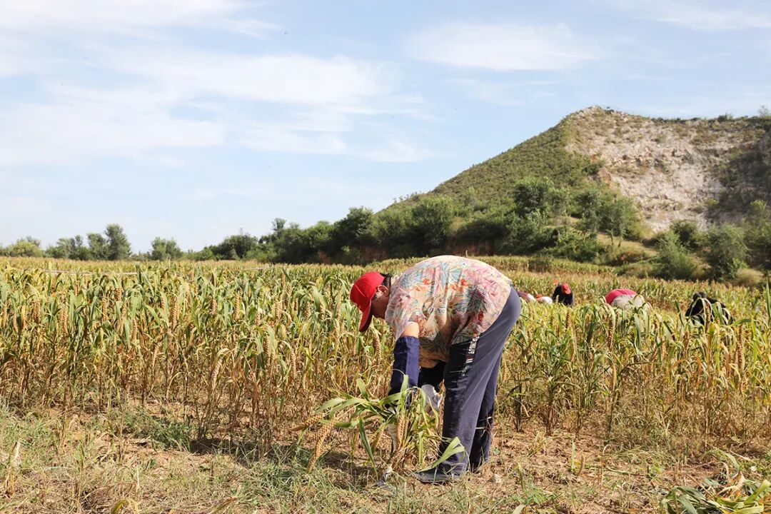 村民采收小米。