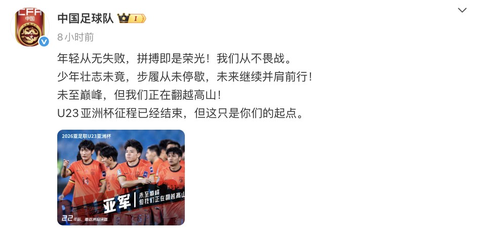 北京时间1月25日凌晨,在2026年U23男足亚洲杯决赛中,中国队以0:4的比分不敌日本队获得亚军。赛后,中国足球队官方发文对球队的表现给予肯定——年轻从无失败,拼搏即是荣光。